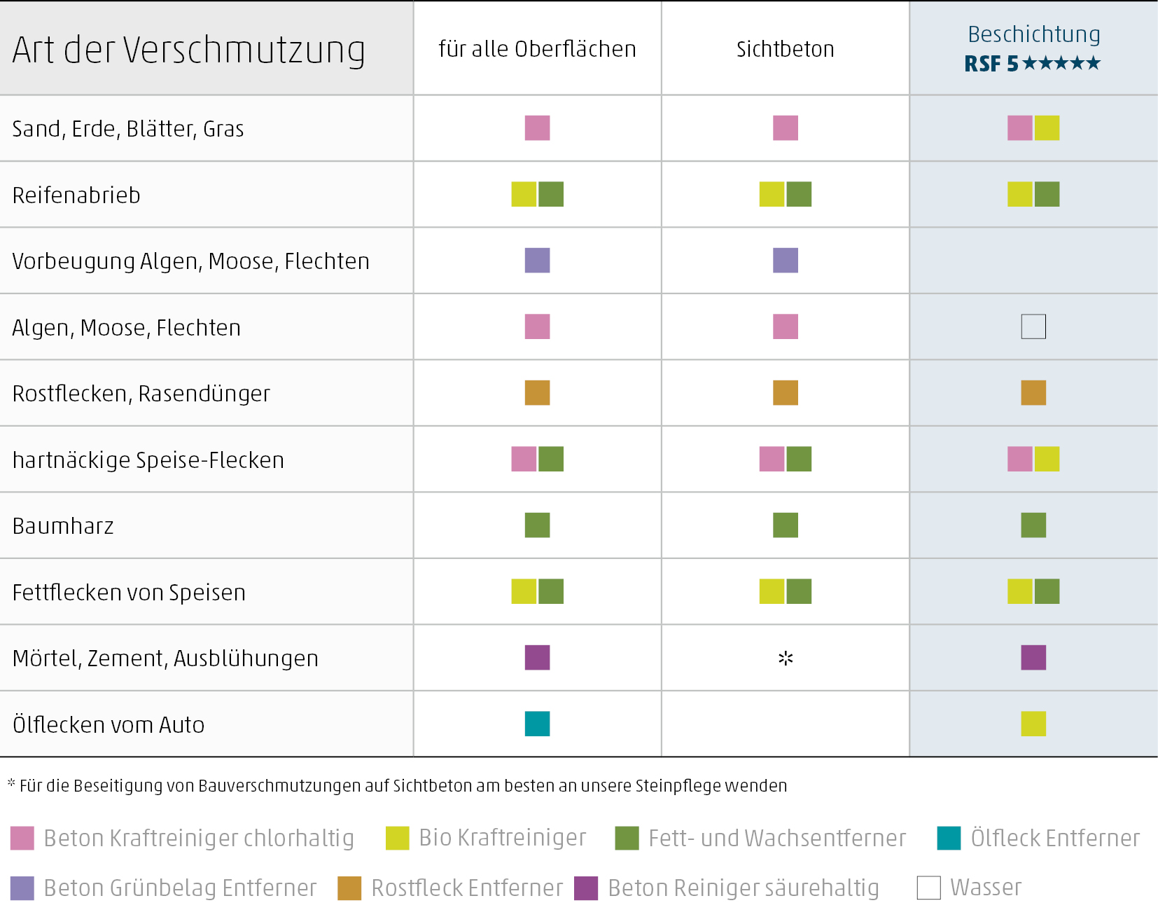Für die unterschiedlichen Verschmutzungen empfehlen wir verschiedene, auf die jeweilige Oberfläche und den Grad der Verschmutzung abgestimmte Reinigungs- und Pflegemittel. Sie sind einfach in der Anwendung, gründlich in der Wirkung und lassen Ihre Außenanlage ohne viel Mühe wie neu aussehen. Wir empfehlen bei den meisten Reinigern eine Anwendung auf der gesamten Fläche, nicht nur die Punktuelle. So ergibt sich ein stimmiges sauberes Gesamtbild. Bei Fragen zur Anwendung erreichen Sie uns kostenfrei unter 0641-6009609.