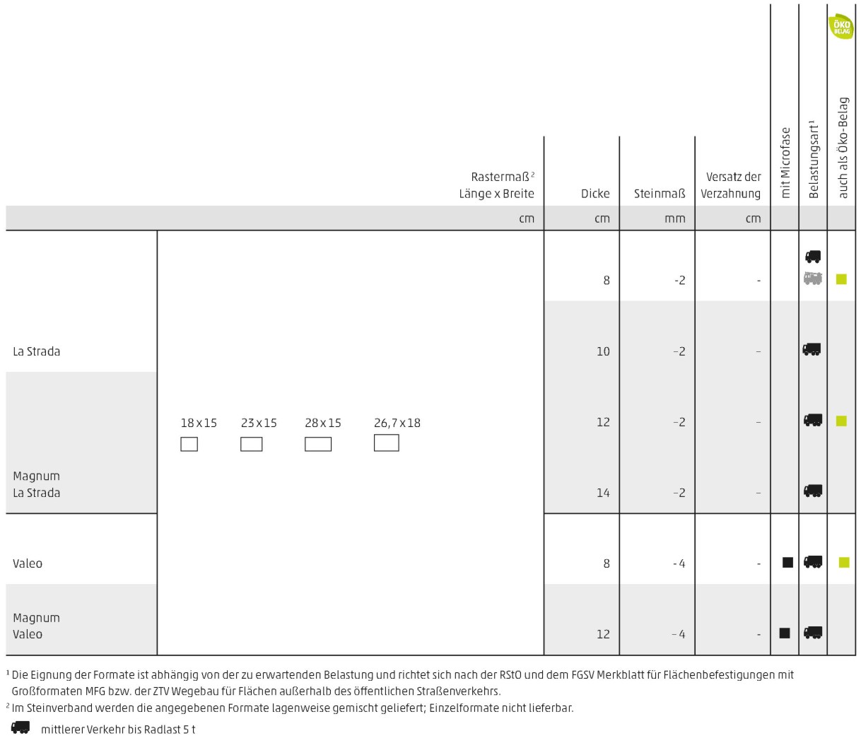 • Bis Belastungsklasse 0,3 gemäß RStO und dem FGSV Merkblatt für versickerungsfähige Verkehrsflächen