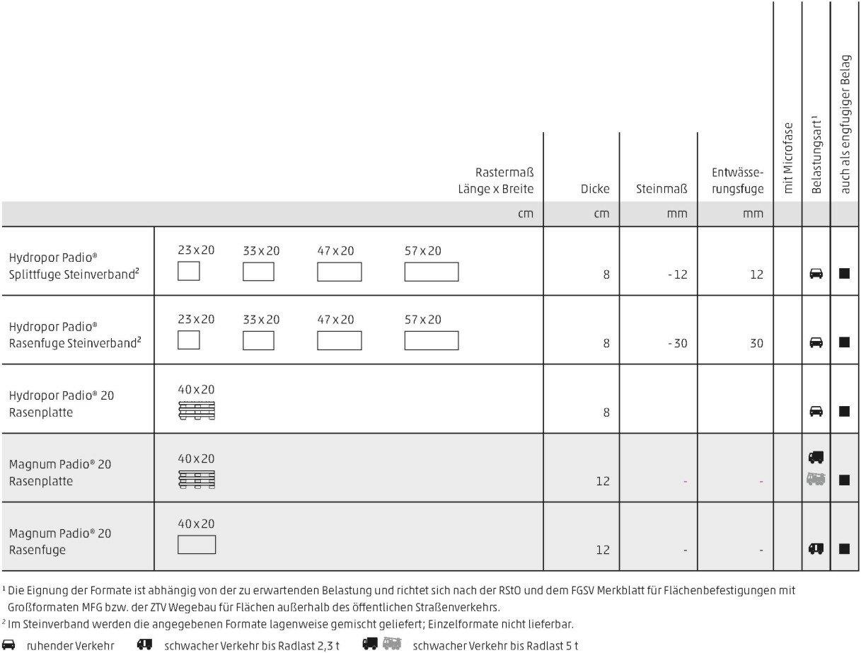 • Einsatzbereich bis Nutzungskategorie N2 gemäß ZTV Wegebau unter Beachtung des FGSV Merkblatts für versickerungsfähige Verkehrsflächen