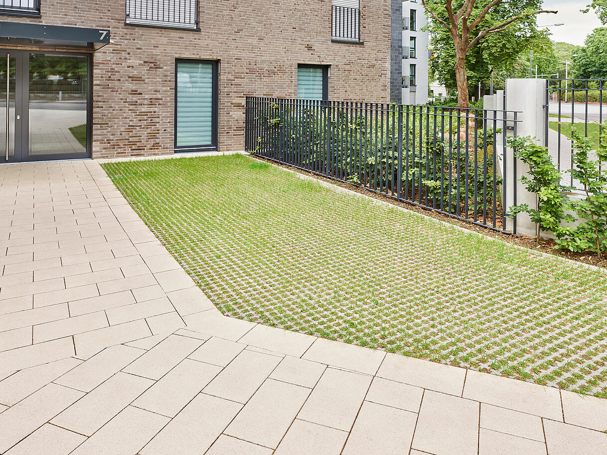 Für die Gestaltung von Parkplätzen mit der Hydropor Rasenwabe eignet sich Siliton Pflaster 24 x 16 cm perfekt als Bänderungsstein.