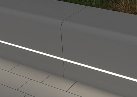Licht im Stein ist ein eindrucksvolles Mittel zur Gestaltung und sorgt auch für Sicherheit. Bauteile können optional mit Aussparungen für LED-Lichtleisten gefertigt werden. Passende Lichtleisten werden von Rinn mit Zubehör