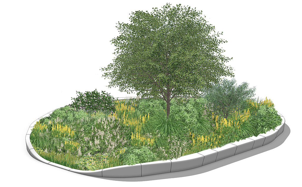 Alle Bauteile können an der Unterseite optional mit einer Durchflussöffnung gefertigt werden. Regenwasser aus der Umgebung kann so gezielt in das Beet als Retentionsraum geführt werden. Detaillösungen werden passend zum Projekt entwickelt.