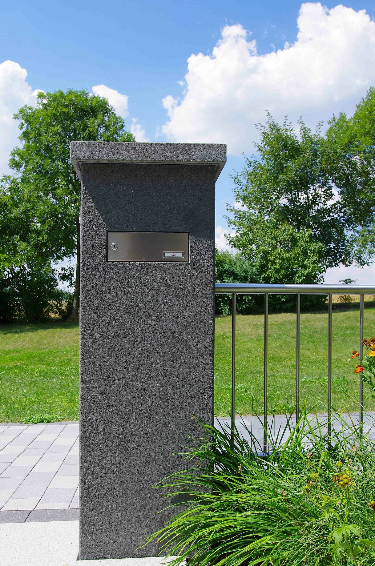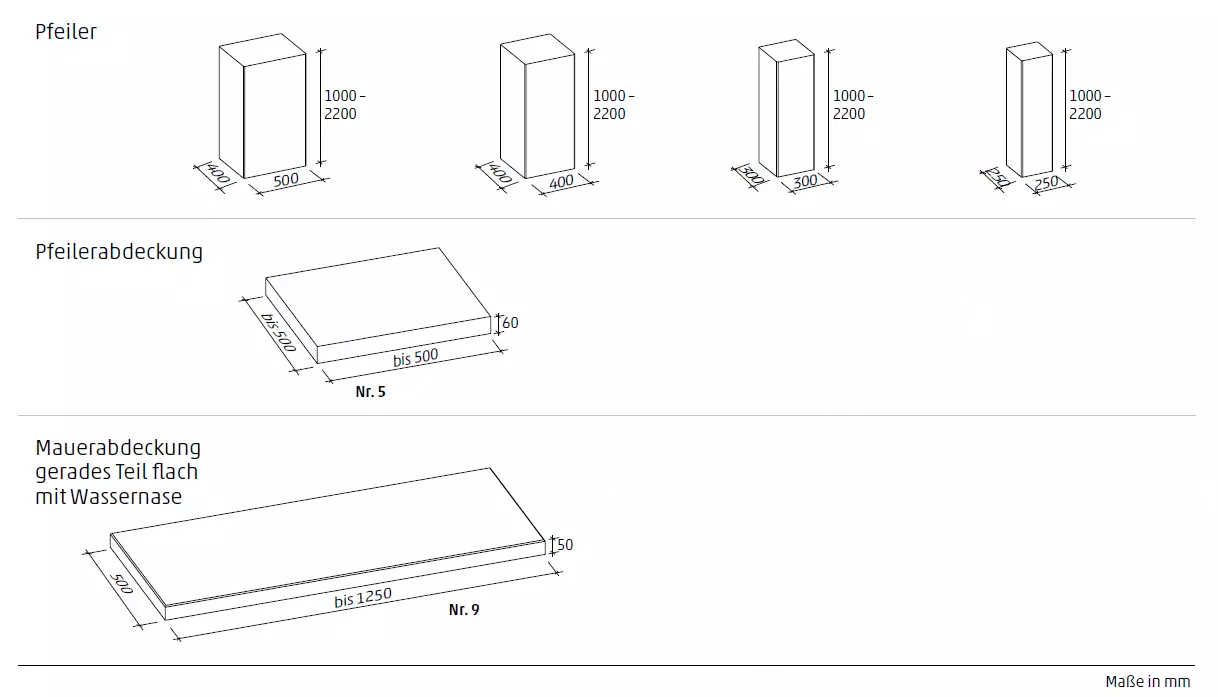 Passend für verschiedene Pfeilerdurchmesser und Mauerbreiten. Mit Wassernase.