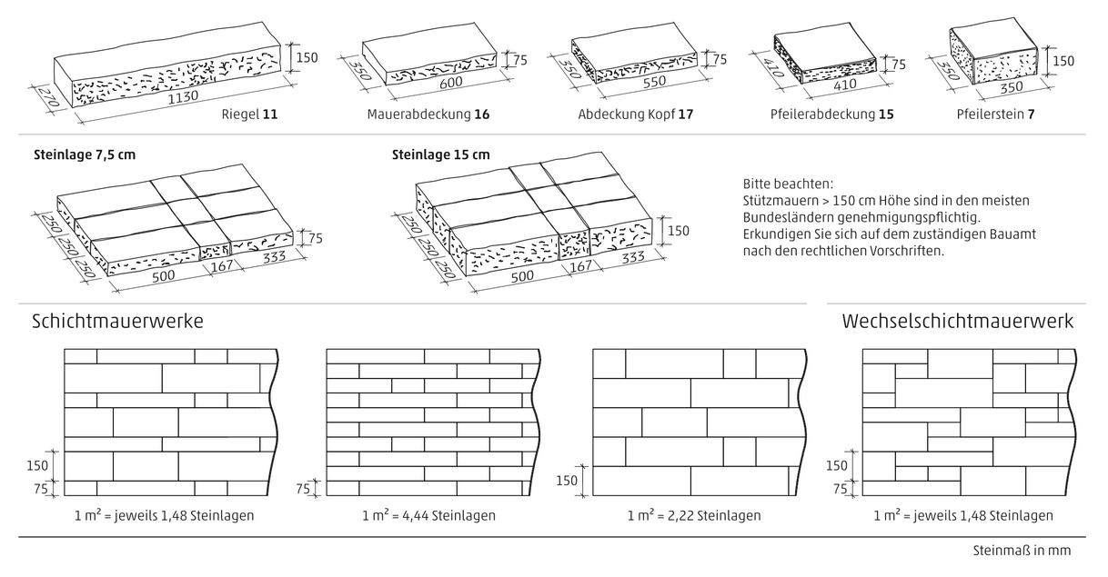 - Große Gestaltungsvielfalt durch 2 Steinhöhen (7,5 cm und 15 cm) in je 3 Steinformaten
