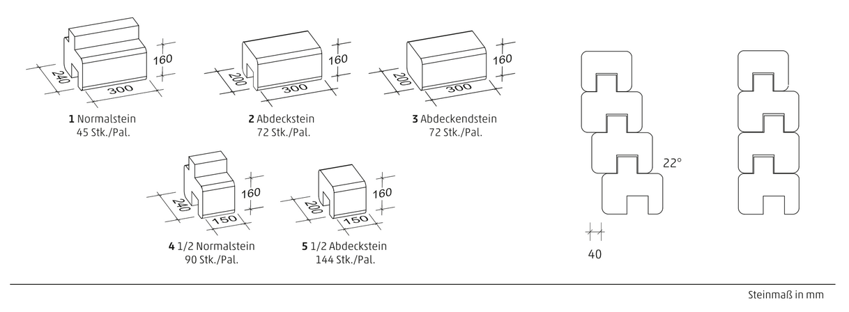 - Aufbau ohne und mit Mauerneigung (ca. 14°) möglich