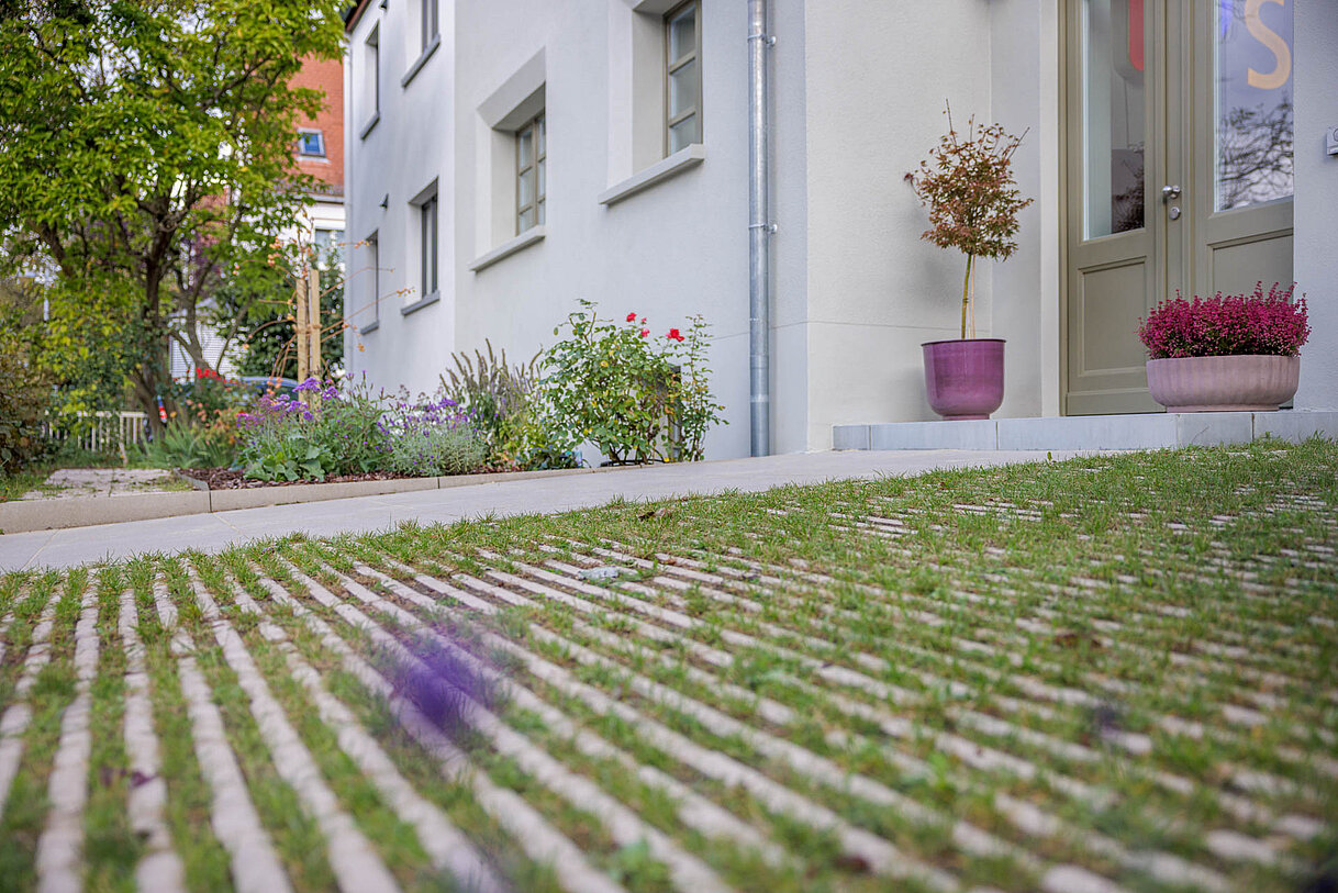 Auf den ersten Blick zeichnet sich die Hydropor KL-Grünfugenplatte durch eine schöne, gerade Linienführung aus. Im Vergleich zu herkömmlichen Rasengittersteinen mit großen Kammeröffnungen ist sie jedoch sehr gut begehbar. Die Hydropor KL-Grünfügenplatte eignet sich zur Befestigung und Gestaltung wasserdurchlässiger Flächen, wie Parkplätze oder Zufahrten, die wahlweise begrünt oder mit Splitt verfüllt werden können. Ein Begrünen ist sehr gut möglich, da die Dicke der Platte genügend Raum für Pflanzsubstrat – Sedumsprossen oder Rasen - lässt und so das Wachstum begünstigt. Bei der Verfüllung der Fugen mit Splitt entsteht durch die geraden Stege eine interessante Fugenoptik. Wird dabei farbiges Füllmaterial eingesetzt lassen sich grafische Akzente erzielen. In Lizenz kann die KL-Grünfugenplatte auch von anderen Herstellern vermarktet werden. Das Original erhalten Sie nur von uns.