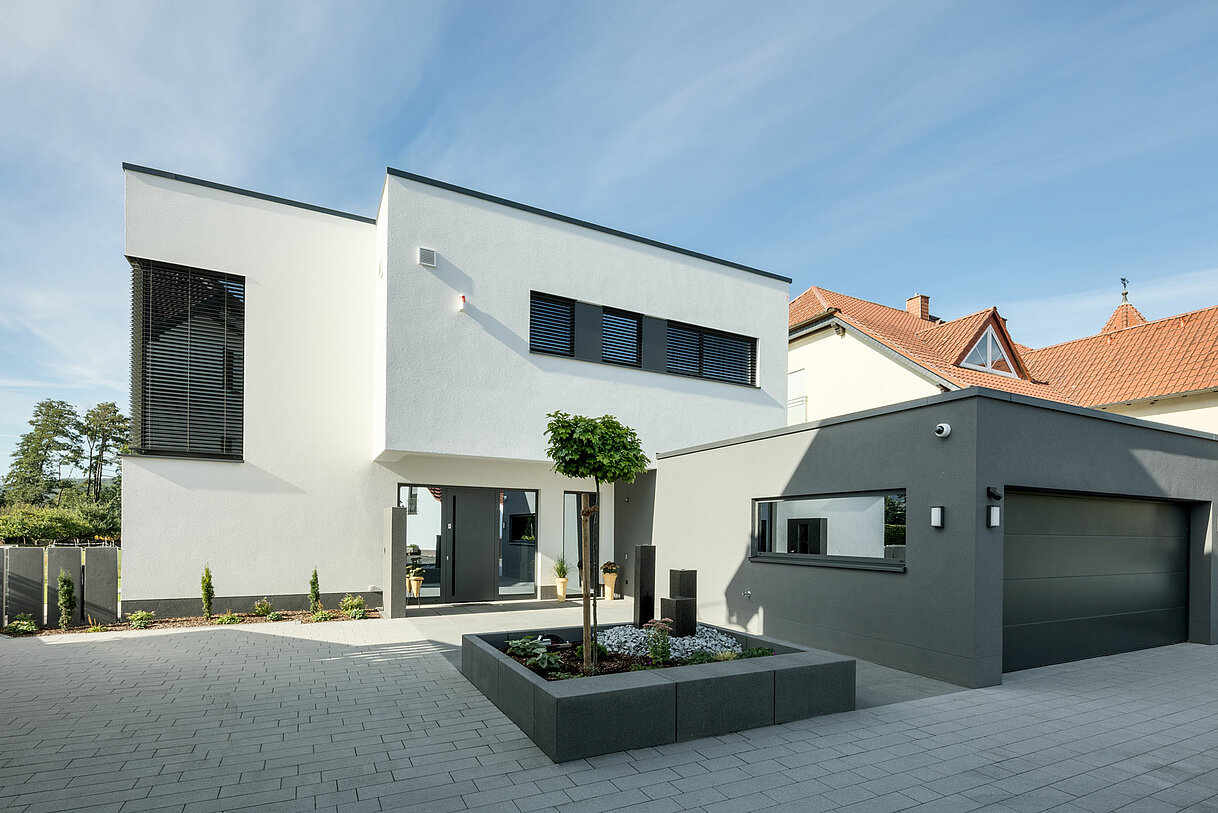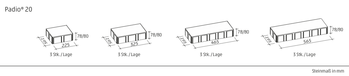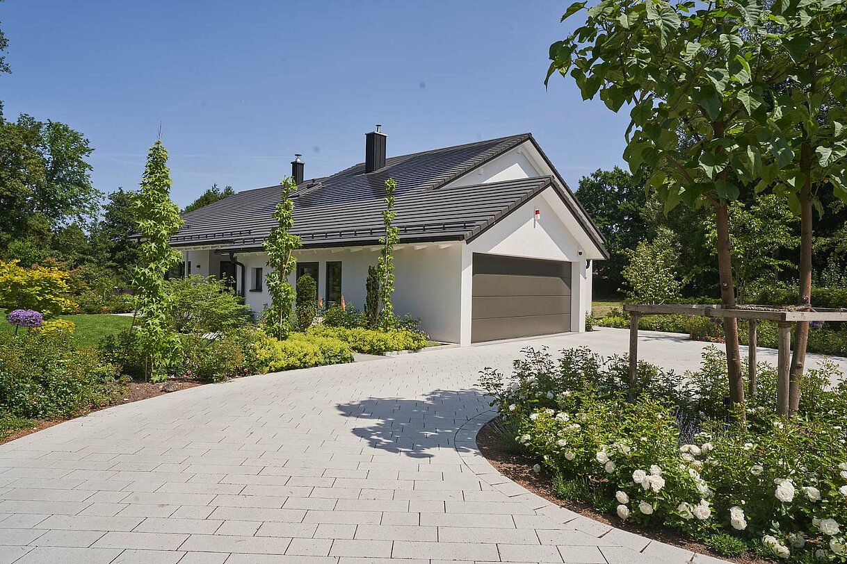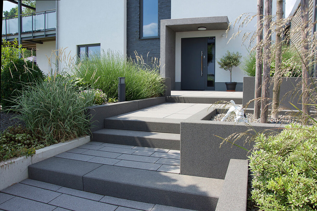 Auffällig an Padio® ist die klare Gliederung der Fläche in schmale Reihen. Das passt besonders gut zu Häusern in modernem Baustil mit geradlinigen Flächen. Auf großen Terrains sorgen edle Farben aus der neo³ Farbkollektion für ein ruhiges Bild. Vier Steingrößen in 20 cm Steinbreite eignen sich für große Einfahrten, Innenhöfe und Vorplätze. Padio® wird linear wie Bahnenware verlegt. Es passt besonders gut zu Häusern mit betonter Linienführung.