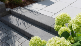 Die kubische Form eines Beton-Podestes können Sie auch in mehrteiliger Bauweise aus Serienelementen erzielen. Dazu werden Blockstufen und Eckblockstufen mit einzelnen Platten oder Pflastersteinen farblich Ton-in-Ton kombiniert. Lösungen für das Überwinden von Höhe gibt es auch abseits von klassischen Stufen aus Beton. Auch Palisaden in Kombination mit gepflastertem Stufenauftritt sind eine Option. Sichtbetonstufen treffen auch Außen auf große Beliebtheit. Sehr gerne greifen Bauherren zu Tönen in Grau und Anthrazit bei Betonstufen. Für einen modernen und cleanen Look sorgen Oberflächen in Sichtbeton Grau. Stufen und Podeste aus Beton lassen sich zu jeder architektonischen Stilrichtung gestalten - egal ob klassische, mediterrane oder moderne Gärten. Rinn bietet Betonstufen passend zu fast allen Bodenbelägen - Pflaster und Platten, Mauern und Fertigteilen. Die Stufen aus Beton sind alle gefast (3 mm). Selbstverständlich sind alle unsere Betonstufen in ihren unterschiedlichen Oberflächen und Farben trittsicher und rutschfest. Beton muss besonders im Außenbereich rutschfest sein. Eine hohe Schutzwirkung gegen Schmutz haben imprägnierte Oberflächen. Welche Beton-Blockstufen imprägniert verfügbar sind, erfahren Sie auf den Produktseiten. Auf Wunsch sind die Blockstufen und Podeste mit Kontraststreifen für eine barrierefreie Gestaltung erhältlich.