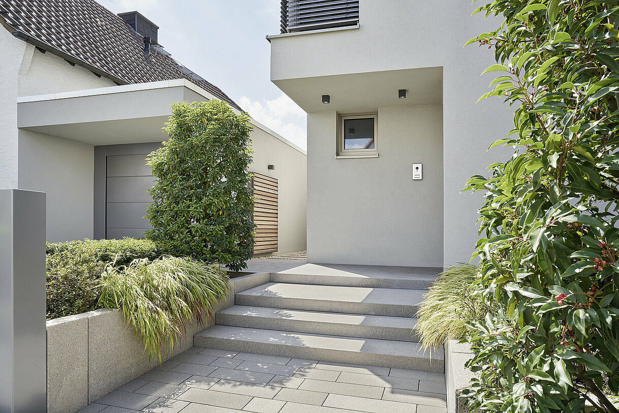 Besonders im Eingangsbereich oder bei Grundstücken in Hanglage sind Treppenstufen in der Gestaltung notwendig. Rinn bietet eine Vielzahl an Block- und Eckblockstufen ab Lager. Mit dem einfachen Baukastensystem der rinnit Basalt Modulstufen können Sie mit nur vier Modulen eine Vielzahl unterschiedlicher Treppenanlagen konstruieren. Besonders zwei- oder dreiseitig begehbare Treppen lassen sich damit einfach und effektiv umsetzen. Wenn hier noch nicht die passende Treppenstufe für Ihr Projekt Außentreppe dabei ist, können alle Stufen auch individuell nach Maß gefertigt werden (Lieferzeit ca. 3- 6 Wochen).