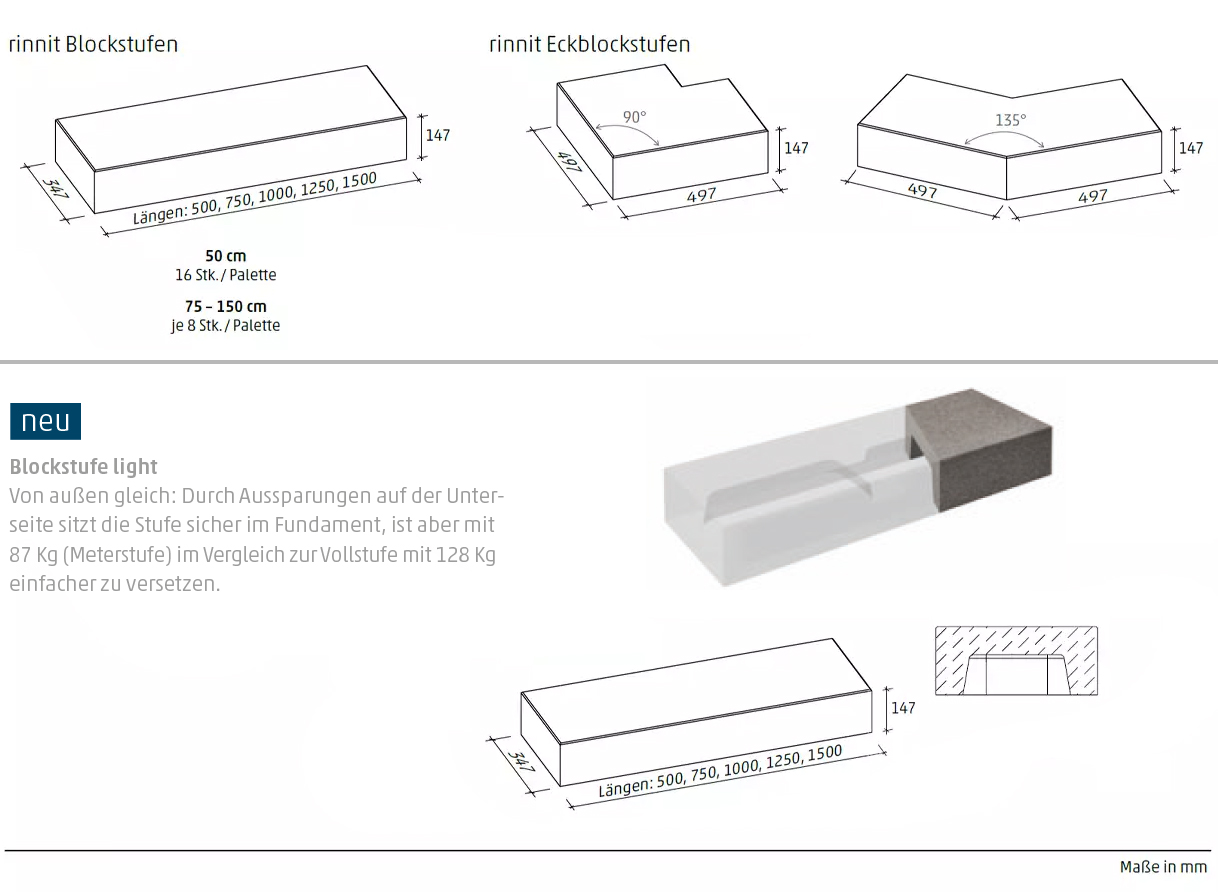 - Eckblockstufen in den Oberflächen Standard und rinnit verfügbar