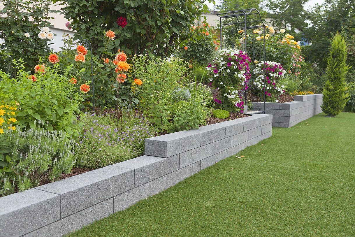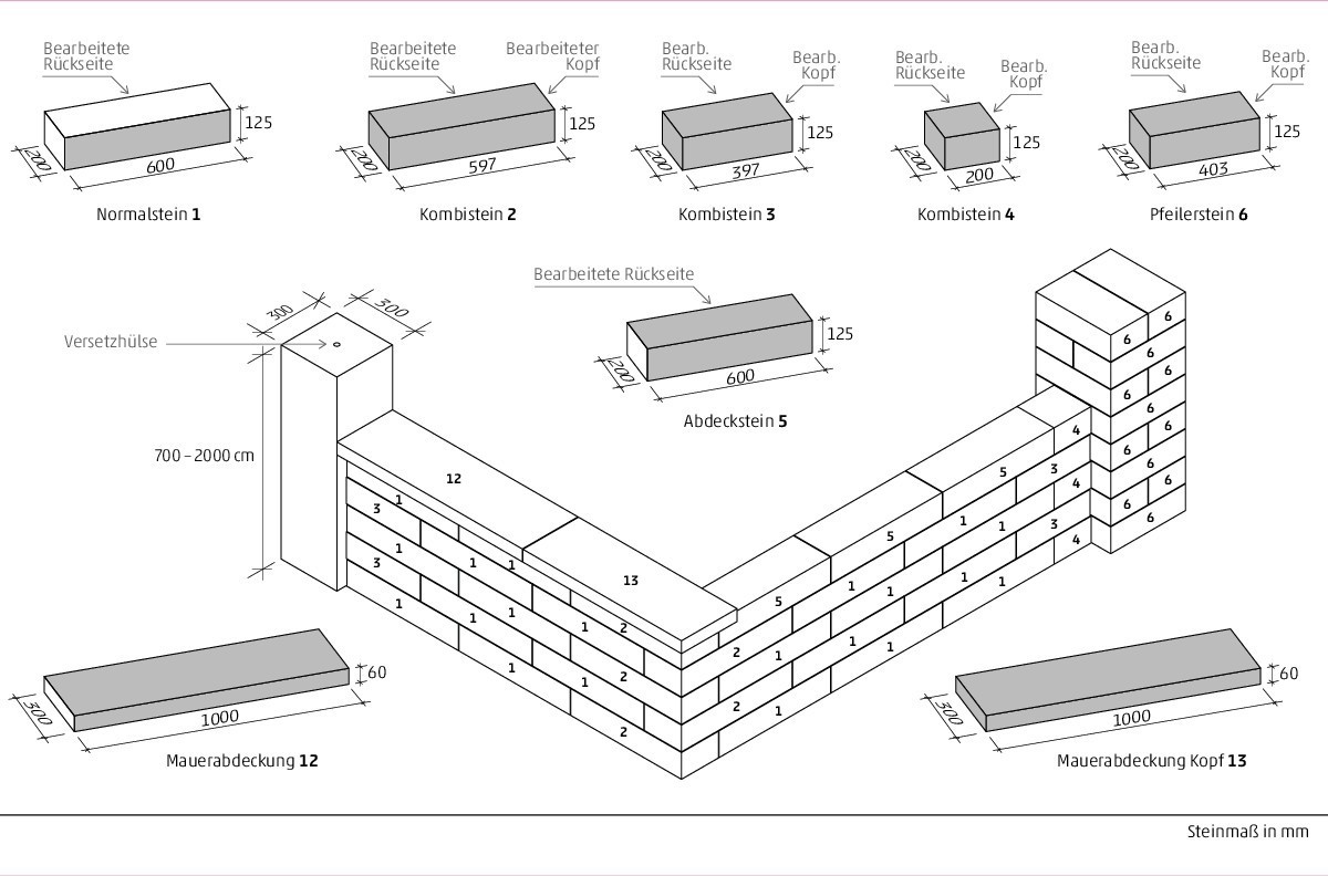 - Aufbau freistehend bis 125 cm Höhe, mit Hinterfüllung bis 75 cm (verklebt)