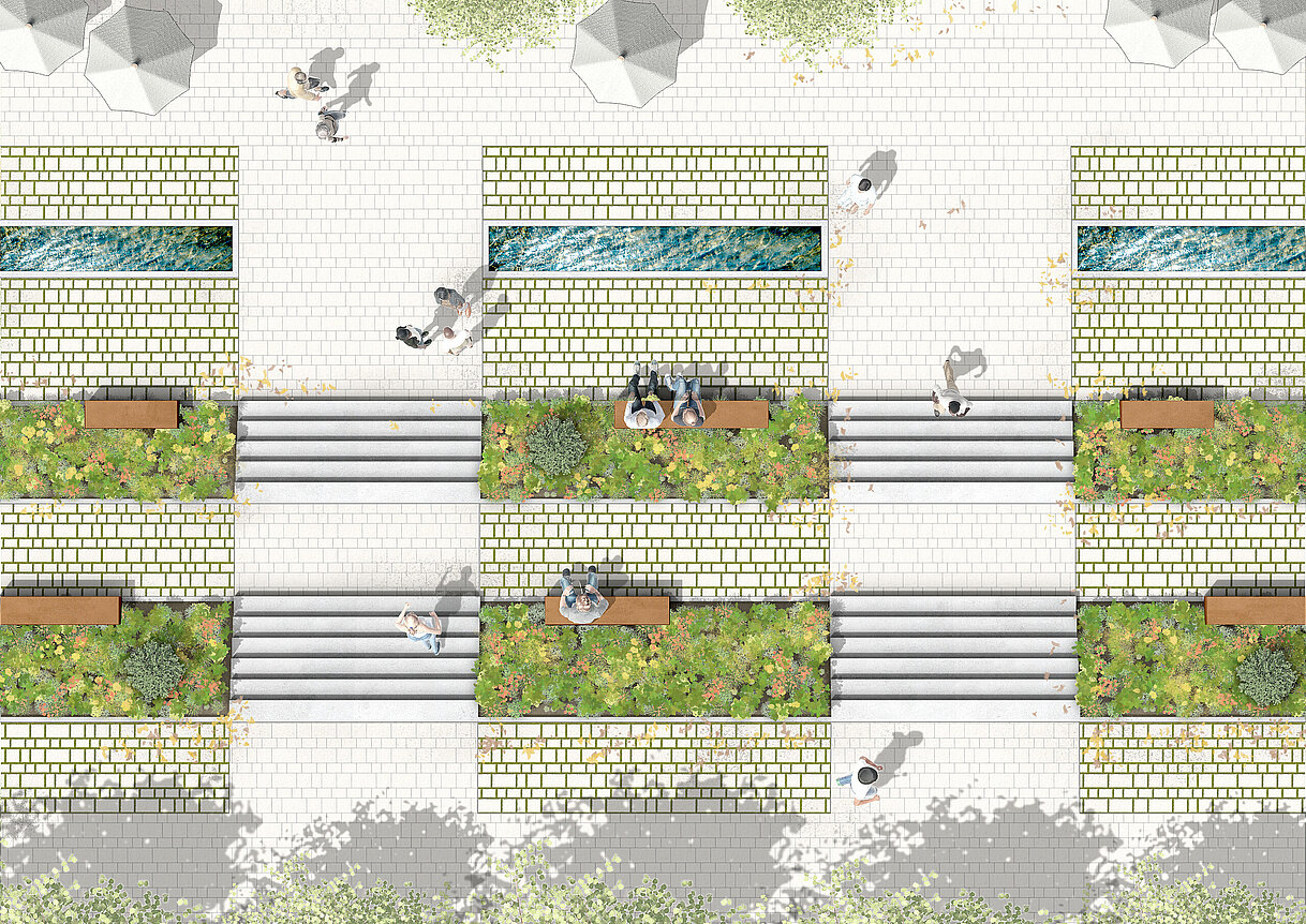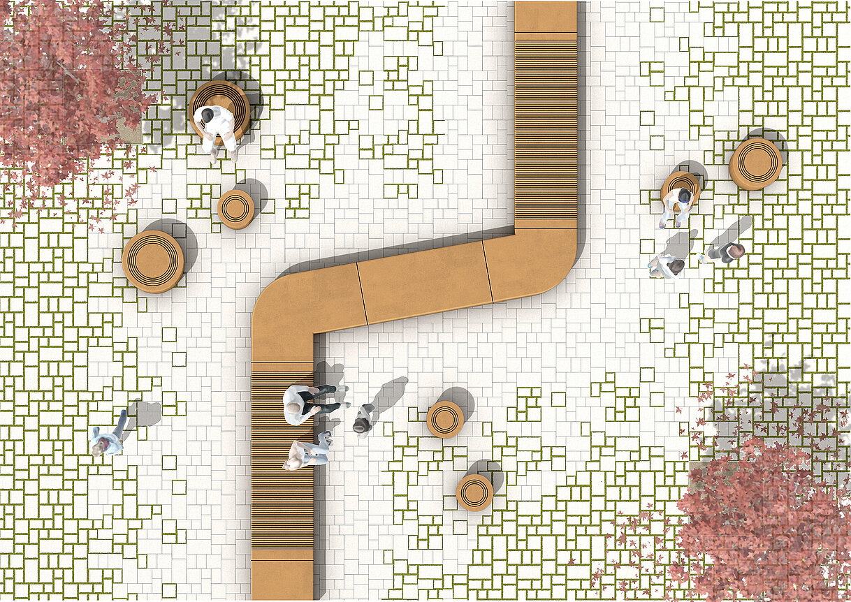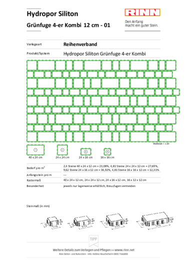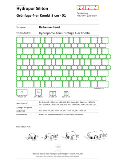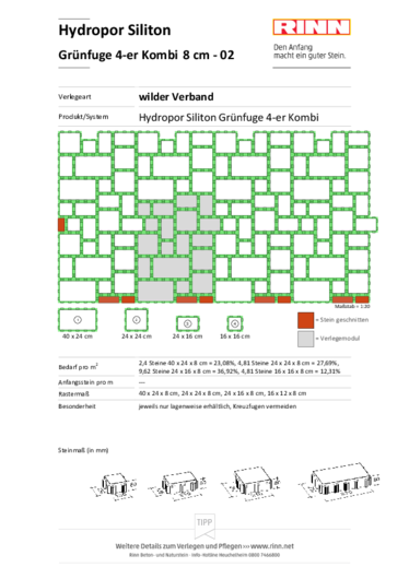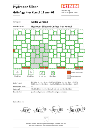 Bei der Verlegung entsteht zwischen den Steinen eine 3 cm breite, gleichmäßige Grünfuge. Die Fuge bietet genügend Raum für Substrat als Grundlage für eine Begrünung der Fläche.