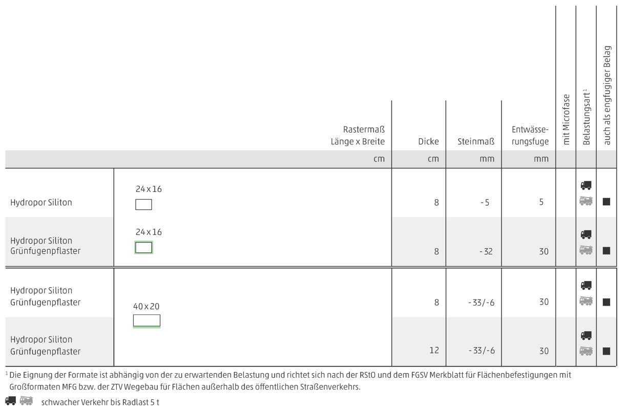 - Einsatzbereich bis Belastungsart ‚Schwacher Verkehr‘ mit gelegentlicher Nutzung durch LKW mit Radlast bis 5,0 t und unter Beachtung des FGSV Merkblatts für versickerungsfähige Verkehrsflächen, MVV