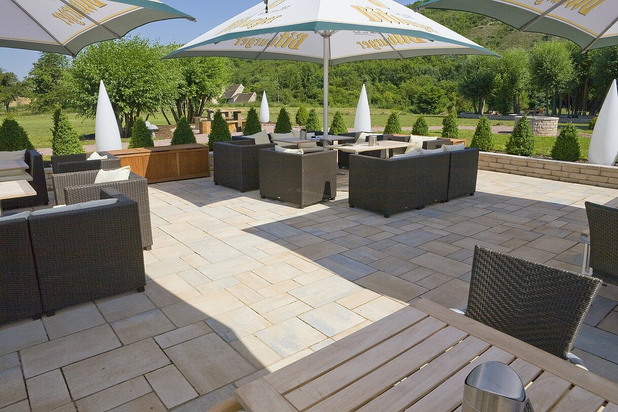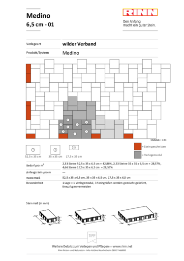 Medino Platten werden in drei Steinformaten passend für eine Verlegung im wilden Verband geliefert. Die Art der Steinkante hängt von der gewählten Oberfläche ab. Platten mit color Oberfläche werden mit Minifase geliefert. Die Steinkanten der rustica Oberfläche sind dagegen sehr schön bossiert und besitzen einen rustikalen Charakter. Die natürlichen Farbverläufe der Medino Platten harmonieren sehr gut mit einem mediterranen Ambiente und können perfekt mit vielen Produkten des Rinn Sortiments kombiniert werden.
