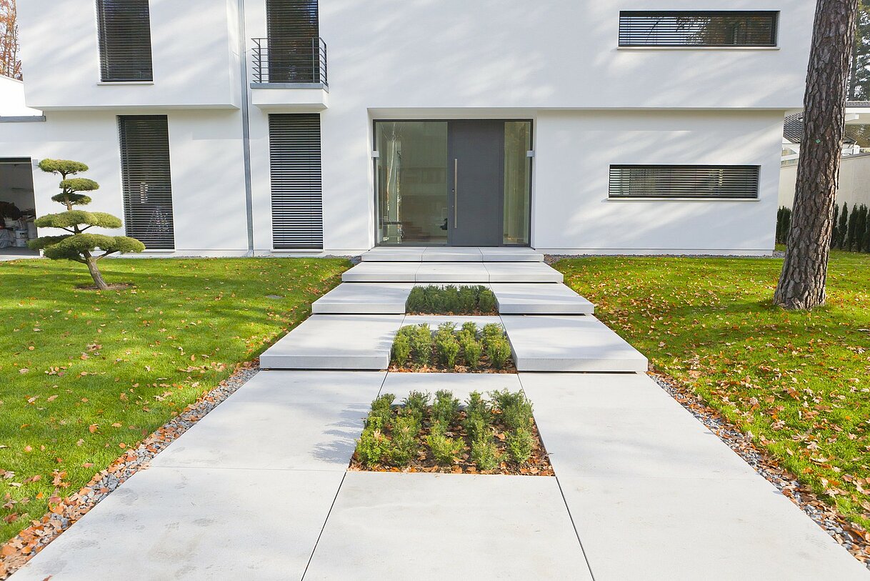 Ein Betonpodest am Eingangsbereich fungiert als funktionaler und gestalterischer Abschluss der Treppenanlage und bietet ausreichend Fläche für einen harmonischen Übergang. Es lässt sich ideal in moderne, minimalistische oder klassische Architekturstile integrieren und ermöglicht durch Varianten wie Radien-, Winkel- oder Trittstufenpodeste eine individuelle Gestaltung – insbesondere bei flach geneigten Geländeprofilen eine architektonisch überzeugende Lösung für einen repräsentativen Zugang.