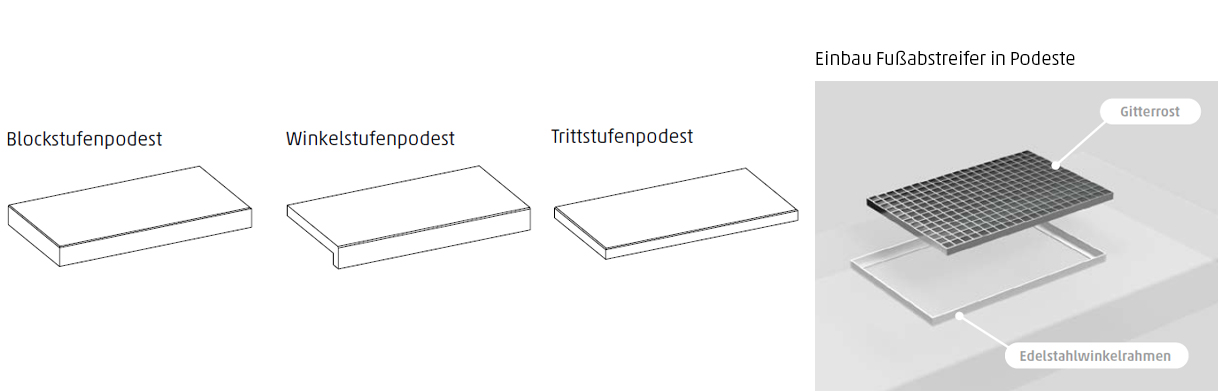 Podeste für Eingangsbereiche sind auf Wunsch werkseitig mit einem integrierten Fußabstreifer erhältlich – wahlweise als Lamellenmatte oder Gitterrost. Es stehen die Größen 40 x 60 cm und 50 x 80 cm zur Auswahl.