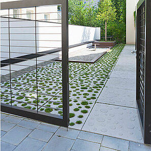 Für eine Flächengestaltung nach dem Schwammstadt-Prinzip bieten sich verschiedene Pflaster zur Kombination an. Ein Übergang von einem sehr gut befahrbaren und naturnah begrünten Versickerungsbereichs in eine Fläche aus Pflaster mit 3 cm Grünfuge ist leicht zu planen. Direkt im Anschluss kann ein engfugiges Pflaster mit anderer Anforderung an die Belastung eingesetzt werden. Weil die Steinformate perfekt abgestimmt sind, fließen und die Reihen einfach ineinander über.