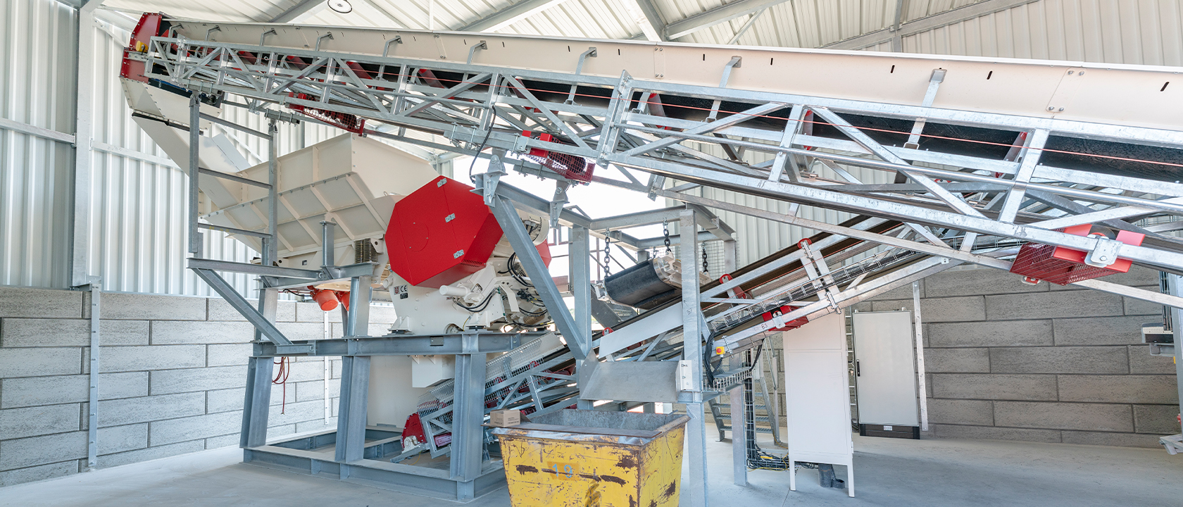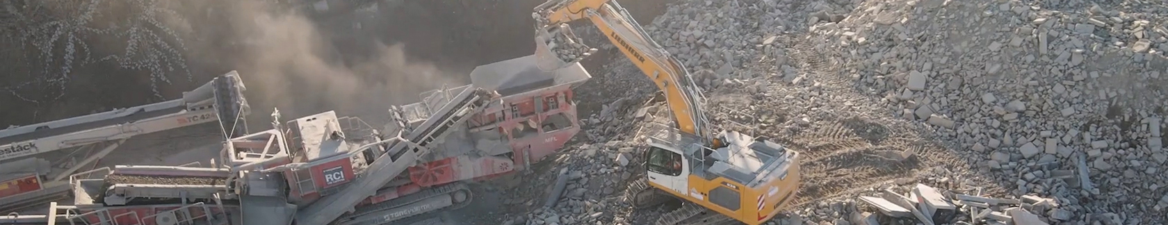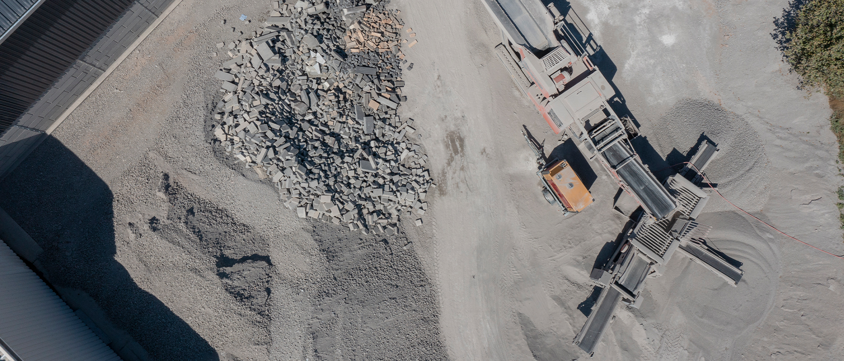 Betonsteine werden mit Brechanlagen zerkleinert, und das daraus entstandene Material wird über Siebe getrennt und sortiert.