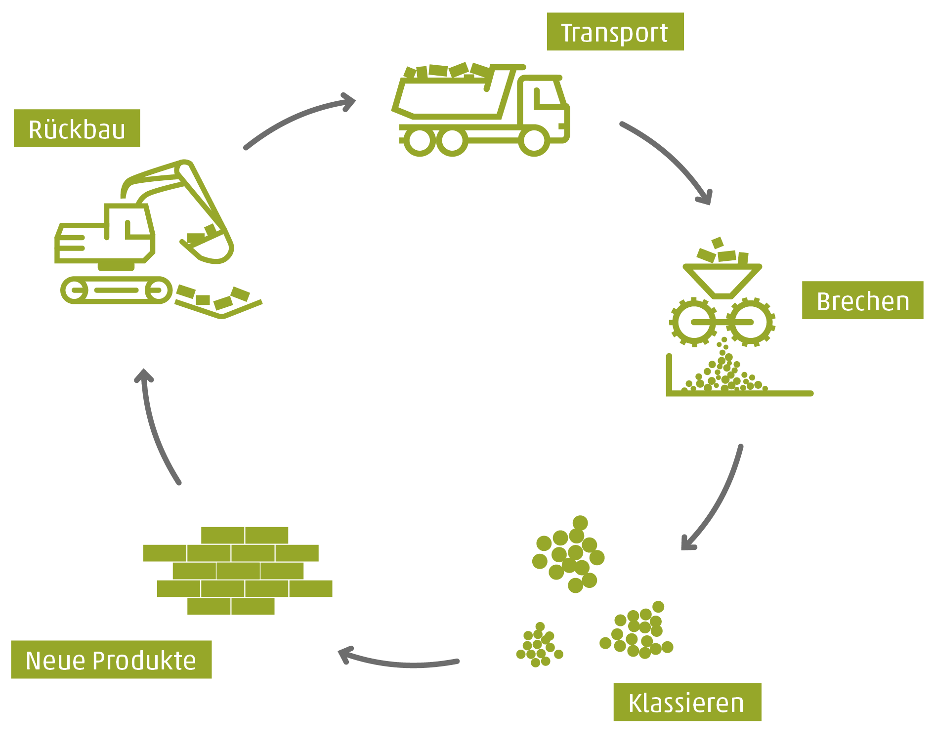 Altpflaster oder Beton-Restmengen werden gesammelt und nach Anlieferung in Brecheranlagen zu Recyclingsplitt und Sand zerkleinert und durch Sieben klassiert. Störstoffe wie z. B. Metalle werden bei dem Aufbereitungsverfahren abgetrennt. Damit steigt die Qualität für die vorgesehene Wiederverwendung deutlich. Die so hergestellten „rezyklierten Gesteinskörnungen“ fließen dann wieder in die Produktion ein, um daraus neue hochwertige Baustoffe entstehen zu lassen.