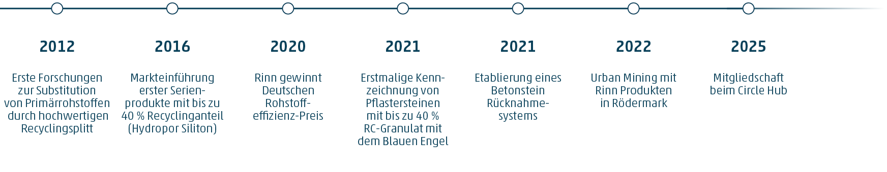 Rinn hat früh angefangen, nach Lösungen zu suchen und erforscht seit 2012 den Ersatz wertvoller Primärrohstoffe wie Kies und Naturstein durch den Einsatz hochwertigen Recyclingsplitts. In der Produktion entstehen oft Reststoffe, beispielsweise bei der Herstellung von Mauern. Aber auch auf Baustellen fallen Betonreste an – hochwertiges Material zu schade zum Entsorgen. Welche Recyclinganteile in welchen Granulatgrößen und -formen in einem Rinn Recycling-Betonstein wiederverwendet werden dürfen, wurde genau berechnet und getestet und daraus ein Präzisionsverfahren entwickelt. Bestätigt wurde das Entwicklungsergebnis von der Materialforschungs- und Prüfanstalt an der Bauhaus Universität Weimar. Erste Serienprodukte mit bis zu 40 % Recyclinganteil konnten bereits seit 2016 auf den Markt gebracht werden. So hat sich der erste Recycling Pflasterstein – der Hydropor Siliton RC 40 - bis heute erfolgreich bewährt und diente als Schlüssel zur Ressourcenwende in der Bauwirtschaft hin zu einer Kreislaufwirtschaft. Weitere Recycling Betonsteine folgten, die sogar mit dem renommierten Umweltzeichen – dem Blauen Engel – gekennzeichnet wurden.