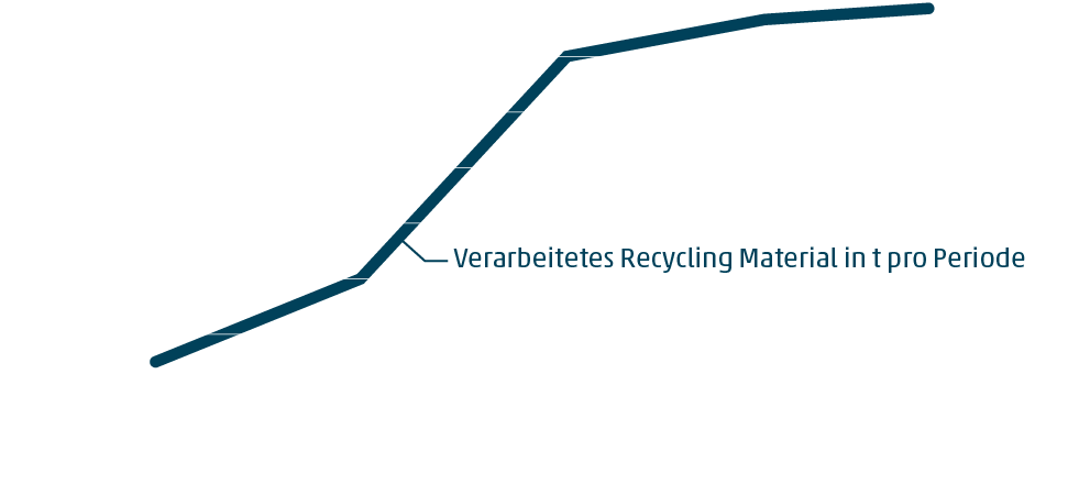 Den Einsatz von Recyclingmaterial in der Produktion konnten wir seit 2015 stetig steigern. Unsere Nachhaltigkeitsberichte spiegeln dieses Ergebnis im zweijährigen Rhythmus wider. Waren es im Berichtszeitraum 2015/2016 noch ca. 15.000 t sind es im Zeitraum 2023/2024 schon 78.000 t Recyclingmaterial gewesen. Tendenz steigend.