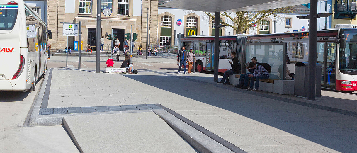 Der Bahnhofsvorplatz ist statt dem motorisierten Verkehr nun weitgehend Fußgängern, Radfahrern und Bussen vorbehalten. Neu ist die Kiss-and-ride-Anlage (Kurzparken) sowie eine Wartehalle für die Busse. Besonderes Augenmerk lag auf der Umsetzung des Themas Barrierefreiheit.
