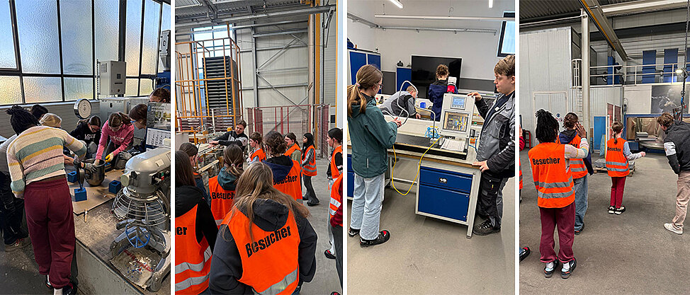Ein praktischer Teil fand im Labor statt. Hier lernten die Schülerinnen, wie Beton hergestellt wird und gossen Figuren aus farbigem Beton in Formen. Zur Erinnerung durften sie die Beton-Schildkröten mitnehmen. In der Ausbildungswerkstatt konnten die Mädchen ihre Geschicklichkeit am „heißen Draht“ ausprobieren und eigene Schlüsselanhänger gravieren, die sie ebenfalls mit nach Hause nehmen durften.