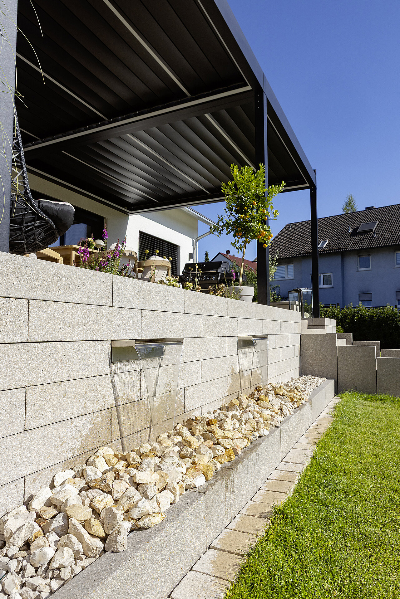 Mit modernen Terrassenplatten in großzügigen Formaten, schlanken Pflastersteinen sowie passenden Stufen und Mauerelementen entstehen harmonisch abgestimmte Außenbereiche. Reinigungsfreundliche Oberflächen mit Beschichtung oder Imprägnierung verschaffen zusätzlichen Komfort. Ein moderner Sichtschutz im Garten aus Beton sorgt für klare Linien und schützt gleichzeitig die Privatsphäre. Ergänzt wird das Gestaltungskonzept durch stilvolle Designelemente in fließenden Formen, Wasserelemente wie zum Beispiel einen modernen Gartenbrunnen und Stufen, Podeste und Sitzblöcke mit LED-Lichtleisten – eindrucksvoll und für Sicherheit sorgend. Auch eine Terrassenbeleuchtung ist sehr gefragt.
