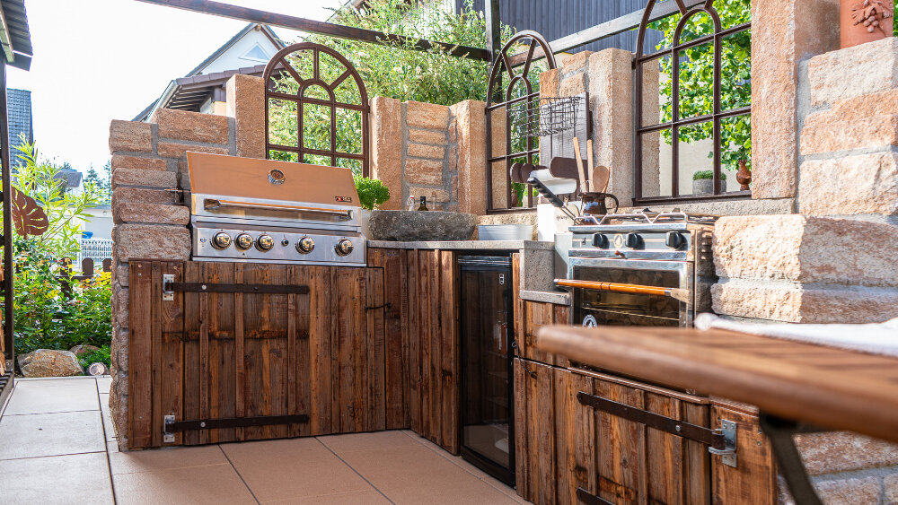 Eine Arbeitsfläche, eine Kochstelle und ein Grill gehören normalerweise zur Grundausstattung. Grill-Modelle reichen von klassischen Holzkohle-Grills über Gasgrills bis hin zu Grillkaminen und Big Green Eggs.