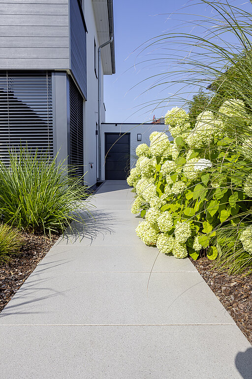 Durch Einfassungen mit neuen Randsteinen oder den Wechsel auf ein modernes Pflaster wie Padio von Rinn – elegant, mit Riegelformaten und klarer Linienführung.
