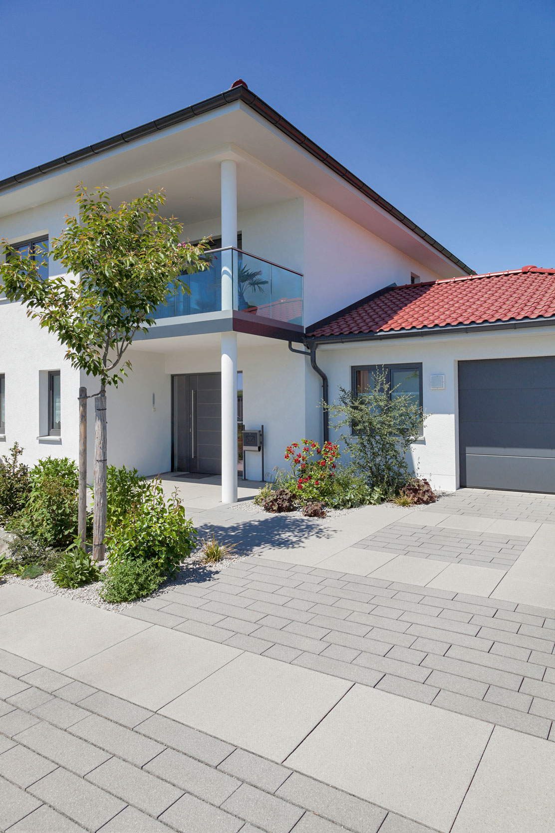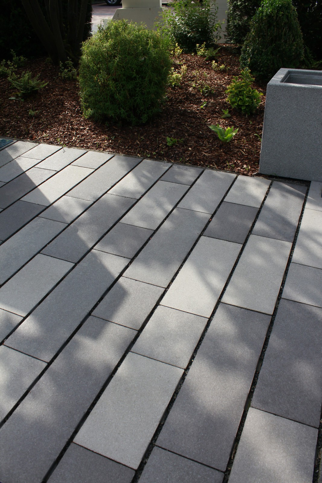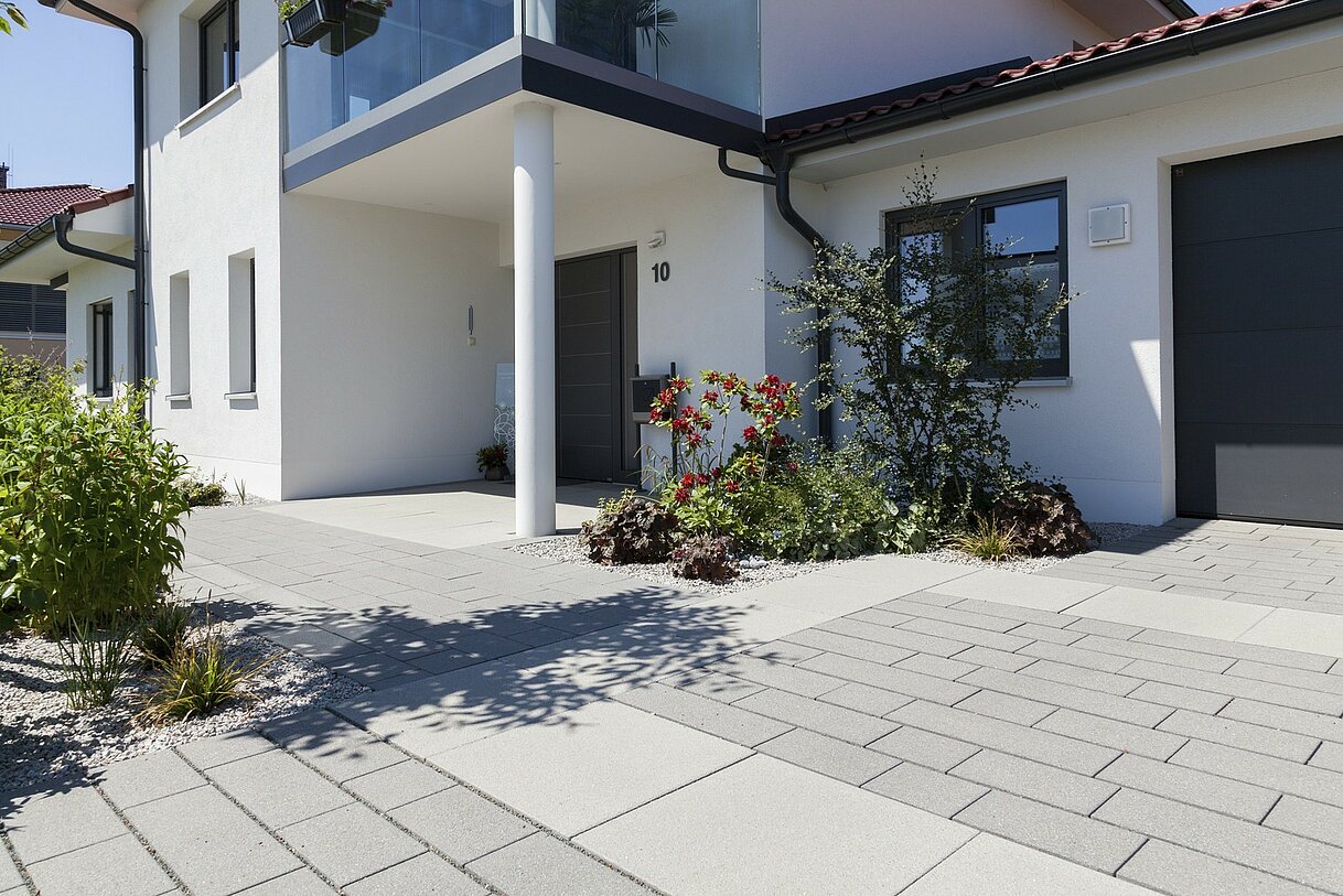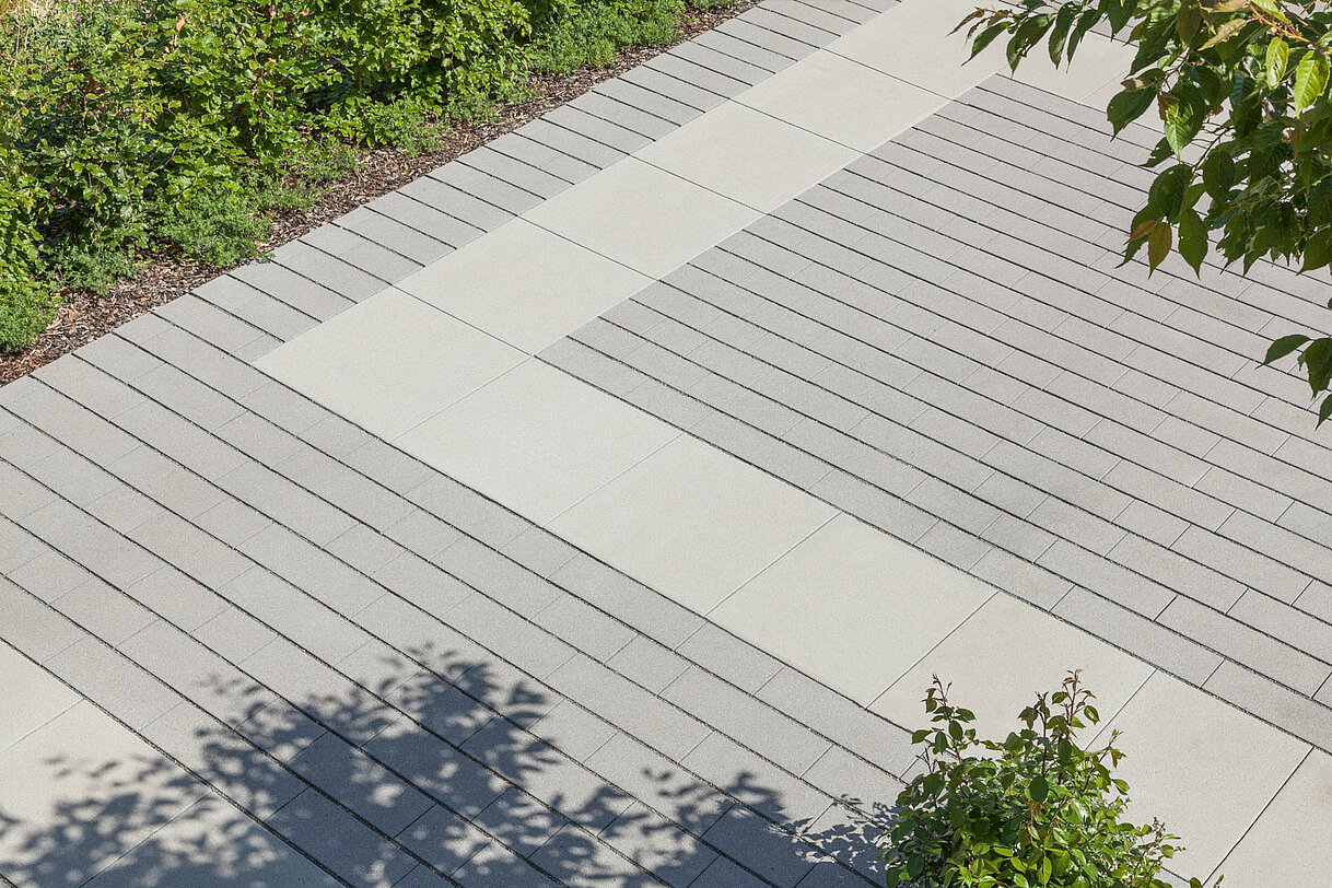 Auffällig an Hydropor Padio® ist die klare Gliederung der Fläche in schmale Reihen. Das passt besonders gut zu Häusern in modernem Baustil mit geradlinigen Flächen. Auf großen Terrains sorgen edle Farben wie rinnit Platin mittel oder Platin dunkel für ein ruhiges Bild. Vier Steingrößen in 20 cm Steinbreite eignen sich für große Einfahrten, Innenhöfe und Vorplätze. Hydropor Padio® wird linear wie Bahnenware verlegt. Es passt besonders gut zu Häusern mit betonter Linienführung.