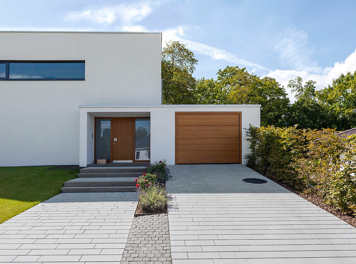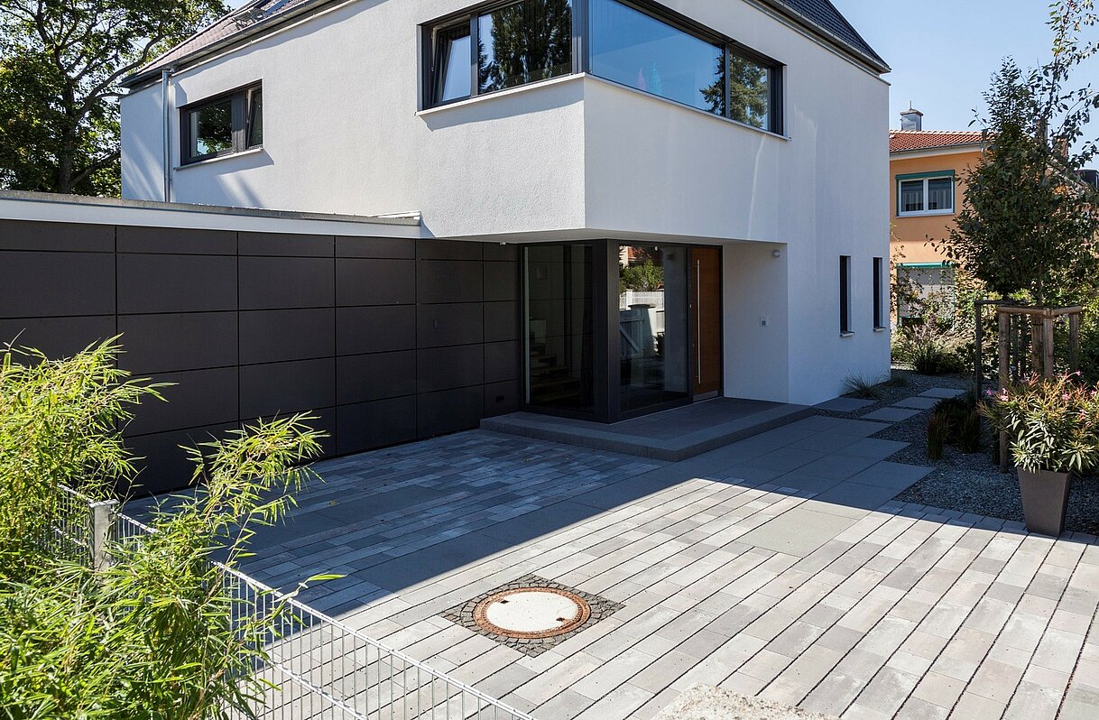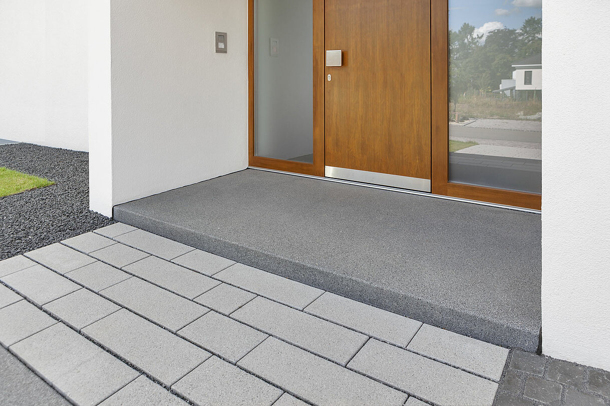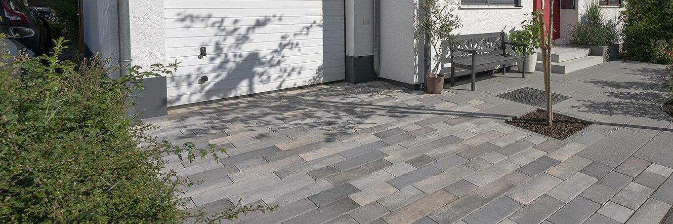Auffällig an Hydropor Padio® ist die klare Gliederung der Fläche in schmale Reihen. Das passt besonders gut zu Häusern in modernem Baustil mit geradlinigen Flächen. Auf großen Terrains sorgen edle Farben wie rinnit Platin mittel oder Platin dunkel für ein ruhiges Bild. Vier Steingrößen in 20 cm Steinbreite eignen sich für große Einfahrten, Innenhöfe und Vorplätze. Hydropor Padio® wird linear wie Bahnenware verlegt. Es passt besonders gut zu Häusern mit betonter Linienführung.