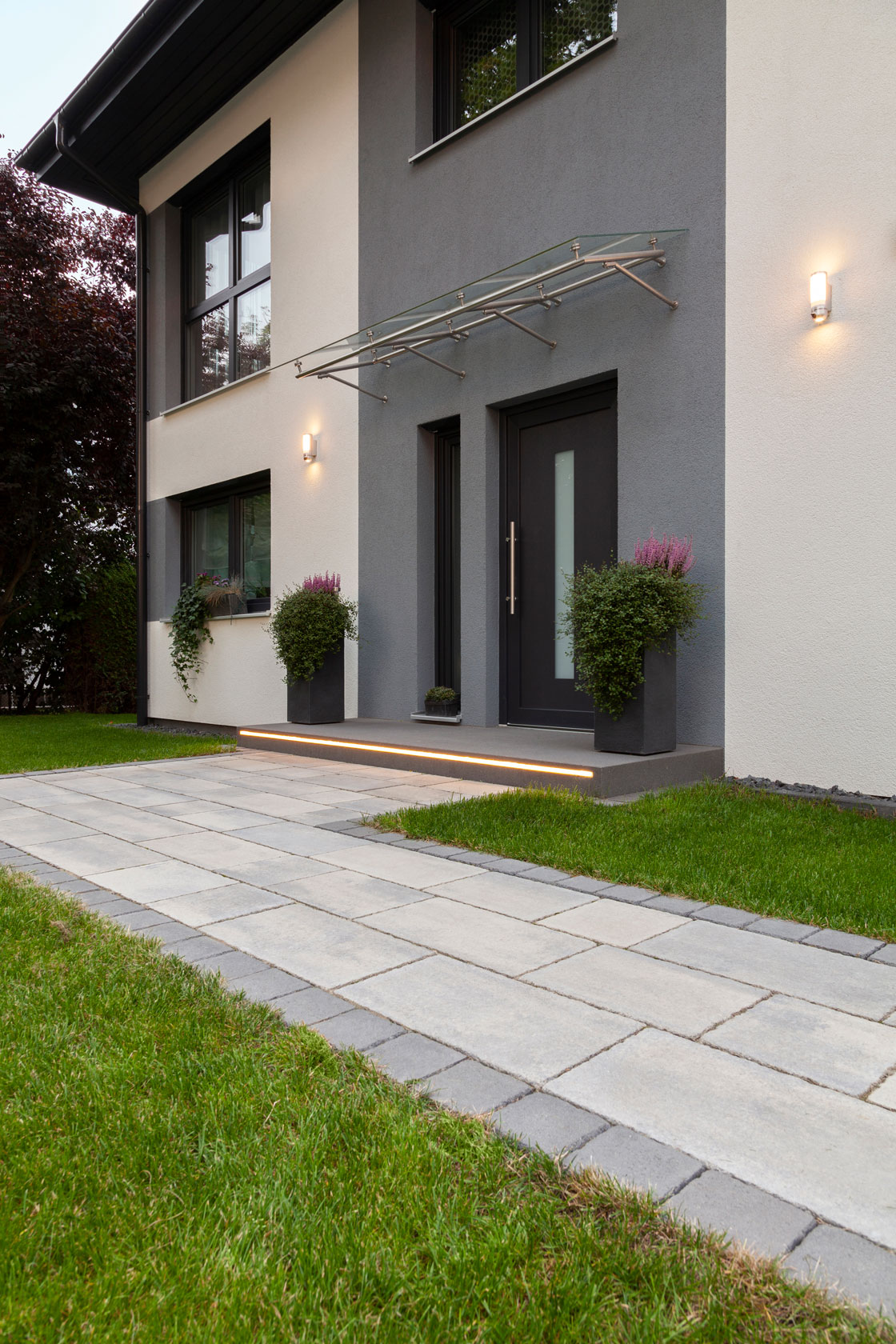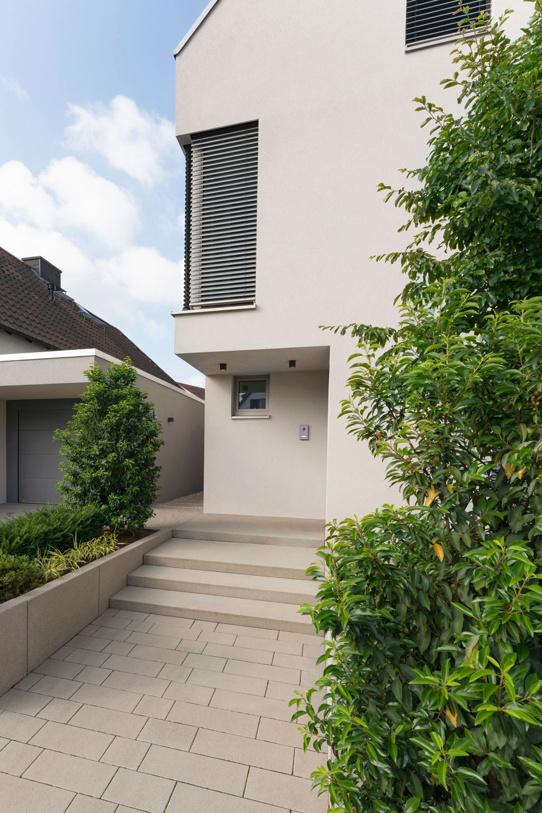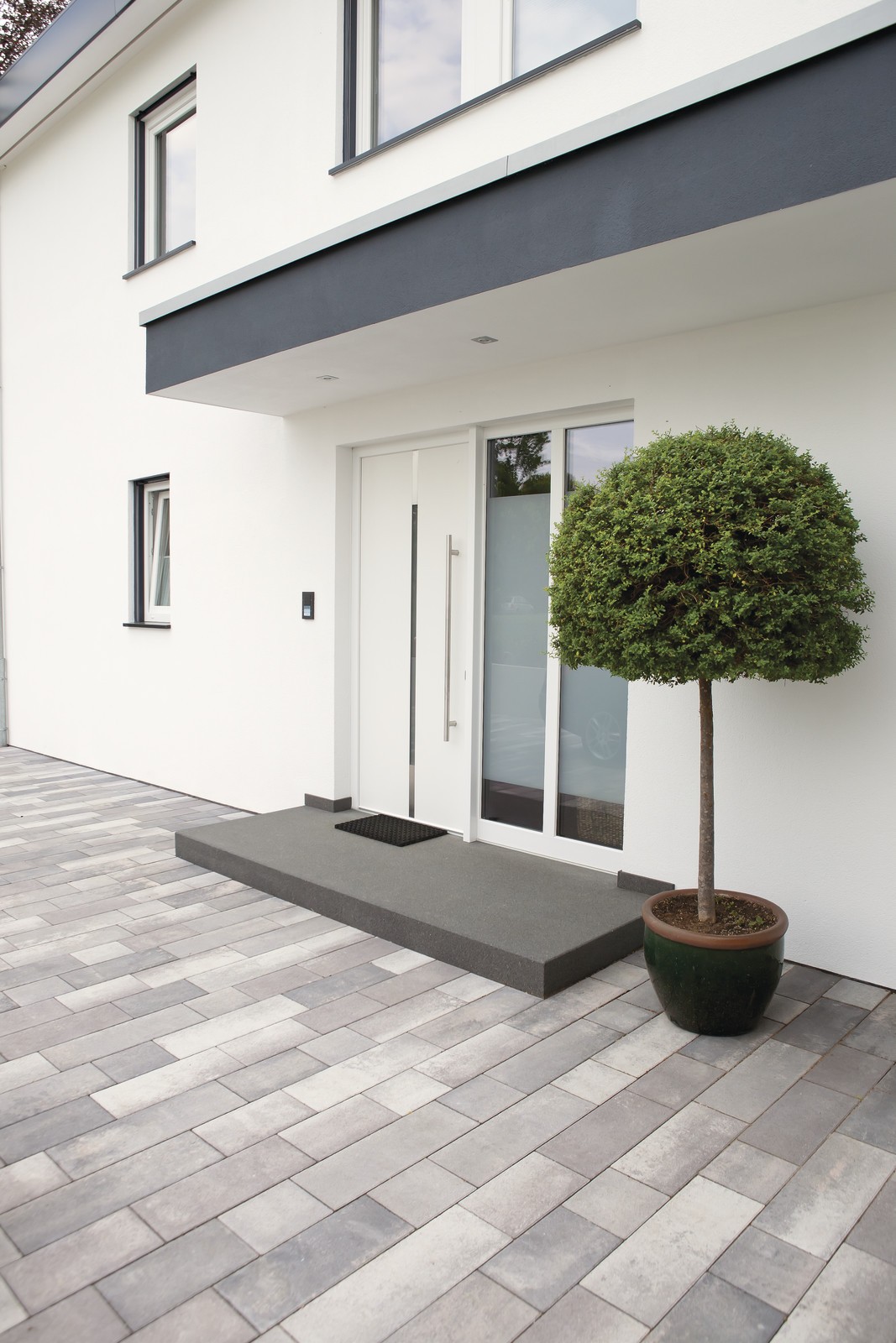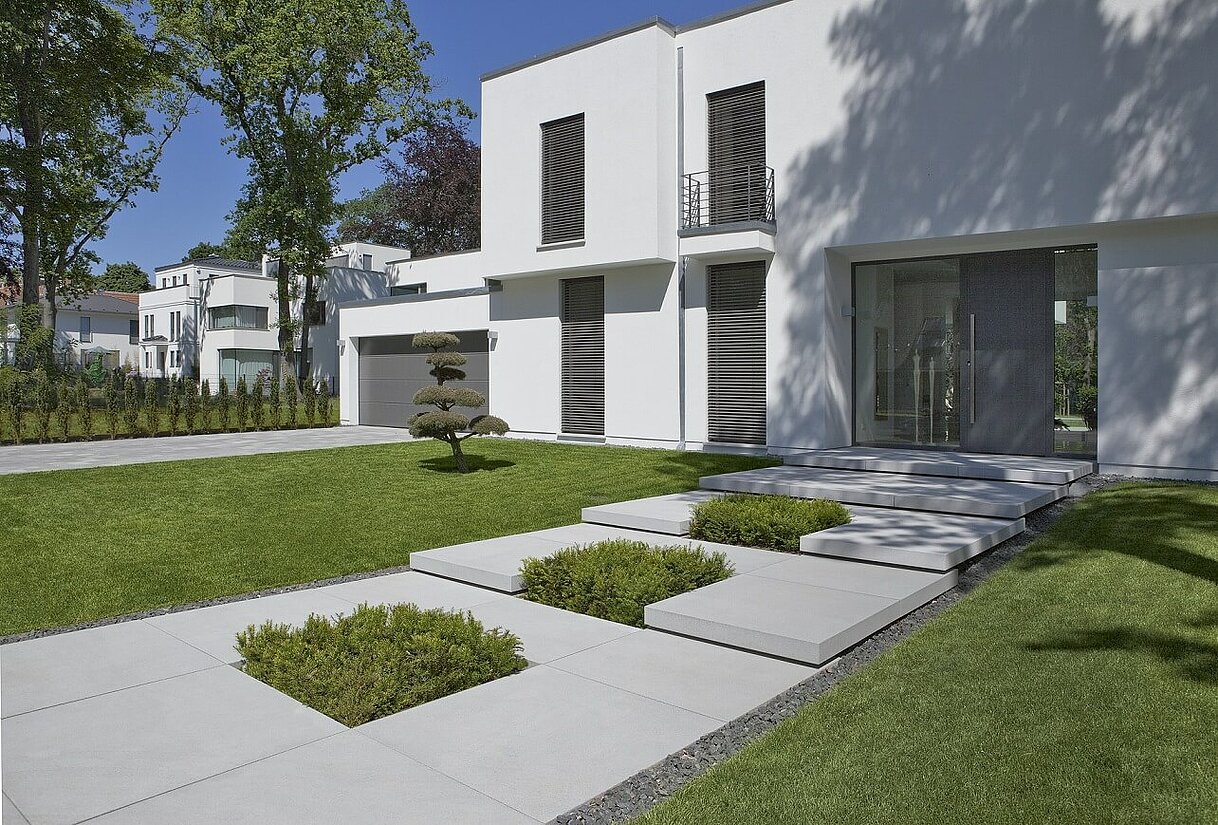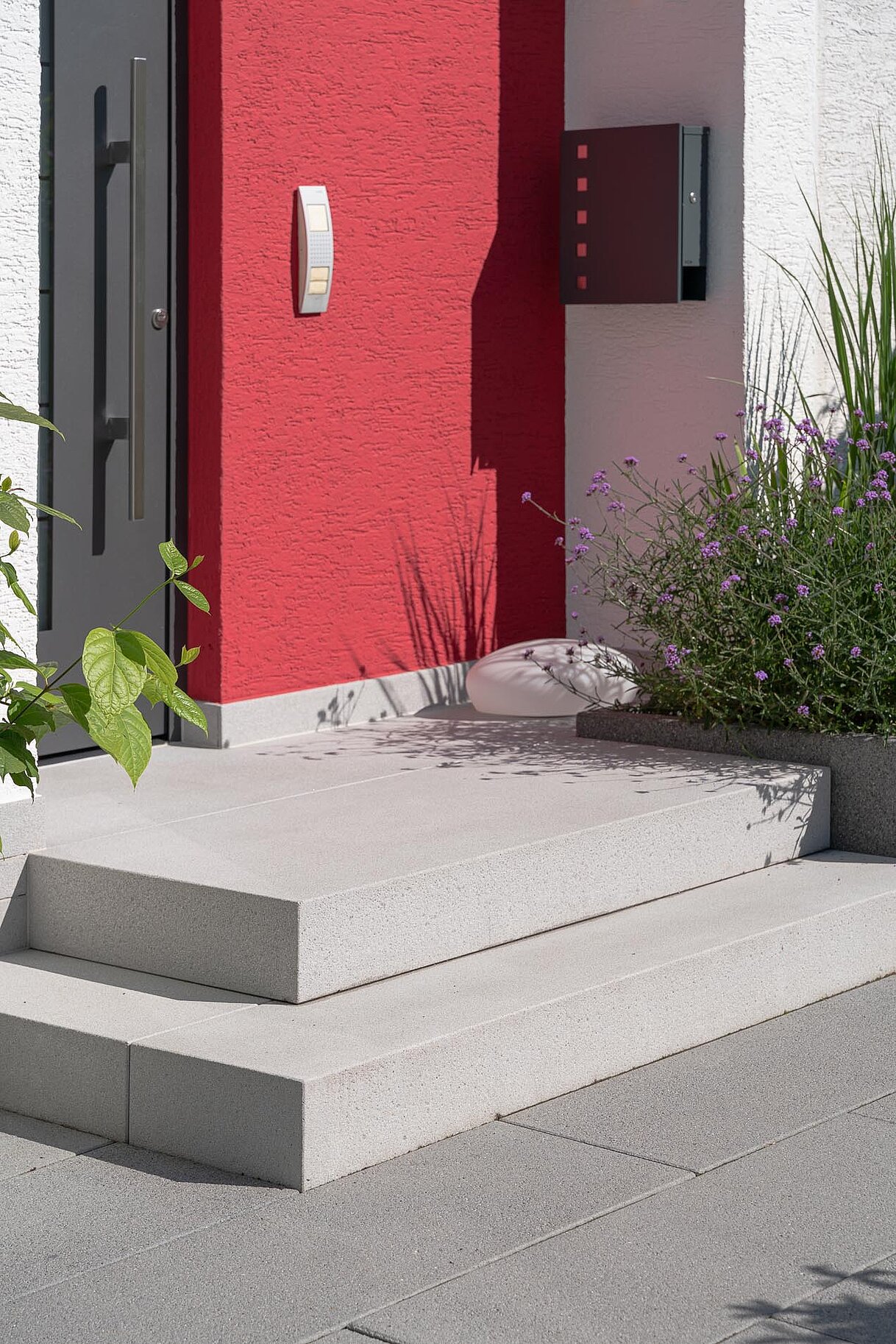 Ein Eingangspodest aus Beton bietet genügend Fläche und dient als Treppenabschluss. Ein Podest im Eingang passt vor allem zu modernen, minimalistischen und klassischen Baustilen. Die Gestaltung des Eingangsbereichs ist auch individuell möglich mit Radien-, Winkel- oder Trittstufenpodesten. Wenn Sie den entsprechenden Raum zur Verwirklichung eines besonders repräsentativen Eingangsbereiches haben, könnte eine Gestaltung mit Podesten genau das Richtige für Sie sein. Besonders geeignet bei eher flachen Geländesituationen.