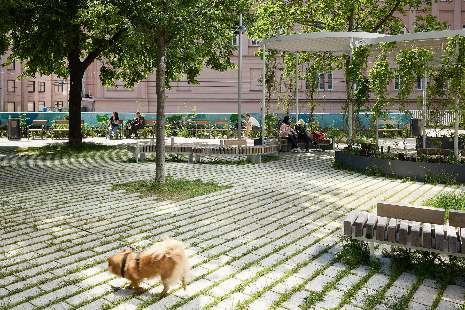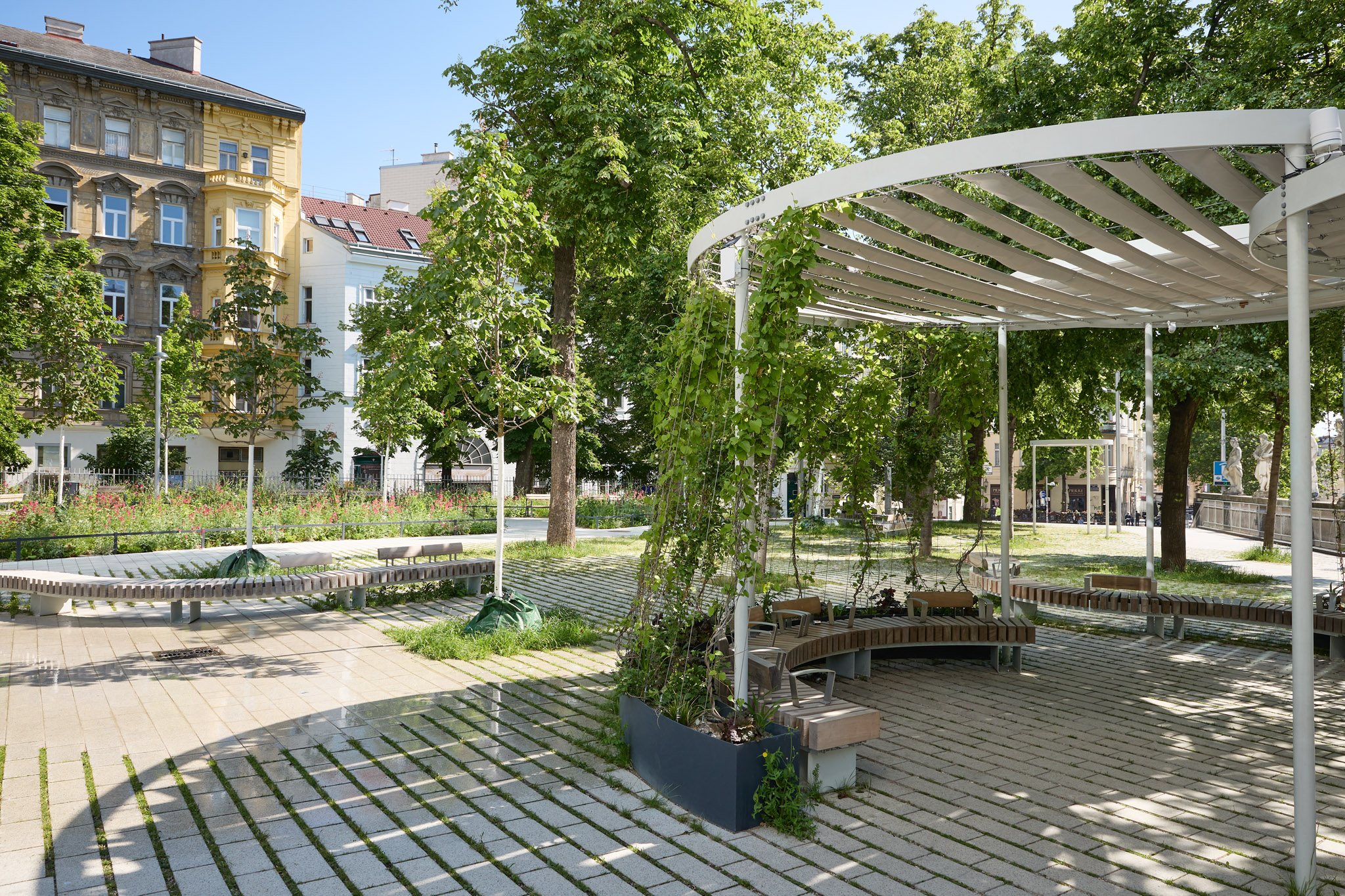 Der Esterházypark liegt prominent zwischen Schadekgasse und Gumpendorferstraße und dient als Eingangsbereich für das beliebte Haus des Meeres. Früher war der Platz von versiegelten Betonflächen dominiert, die in den heißen Wiener Sommern kaum Aufenthaltsqualität boten. Die Landschaftsarchitektin Carla Lo verfolgte in ihrer Planung das Ziel, den Platz zu entsiegeln und in eine lebendige, grüne Oase zu verwandeln. Dabei sollte nicht nur ein ästhetisch ansprechender Freiraum geschaffen werden, sondern auch ein Ort, der Anwohnern und Besuchern gleichermaßen als essenzieller Erholungsraum dient und das städtische Klima aktiv verbessert. Das innovative Konzept löste das klassische, strenge Parkraster auf und setzte auf fließende Übergänge. Das Ergebnis ist eine naturnahe Gestaltung, bei der das Grün seinen Platz zwischen den Pflasterfugen findet. Die landschaftsarchitektonische Sogwirkung hat den einladenden Platz in der Zwischenzeit zu einem zentralen Treffpunkt werden lassen.