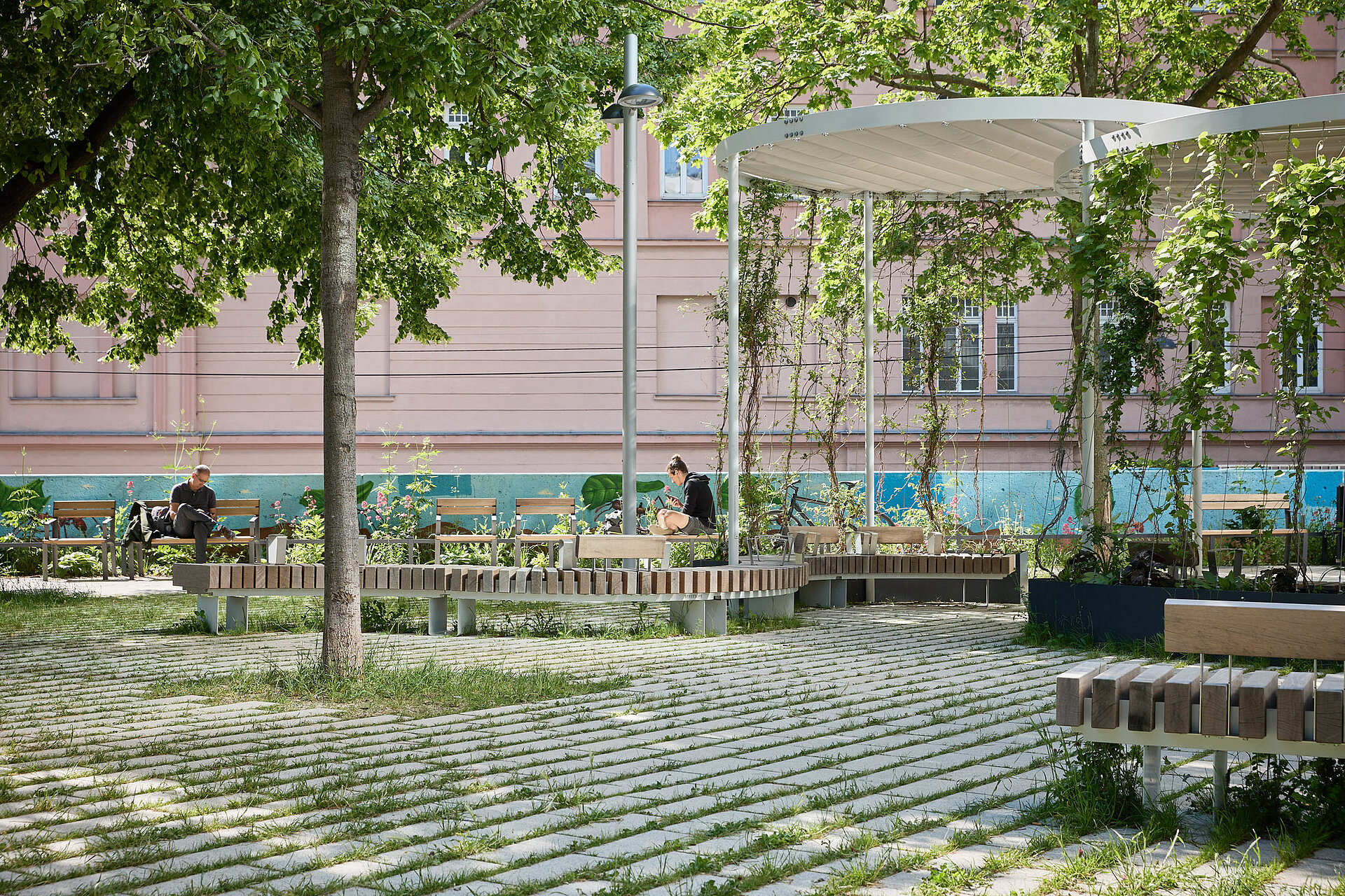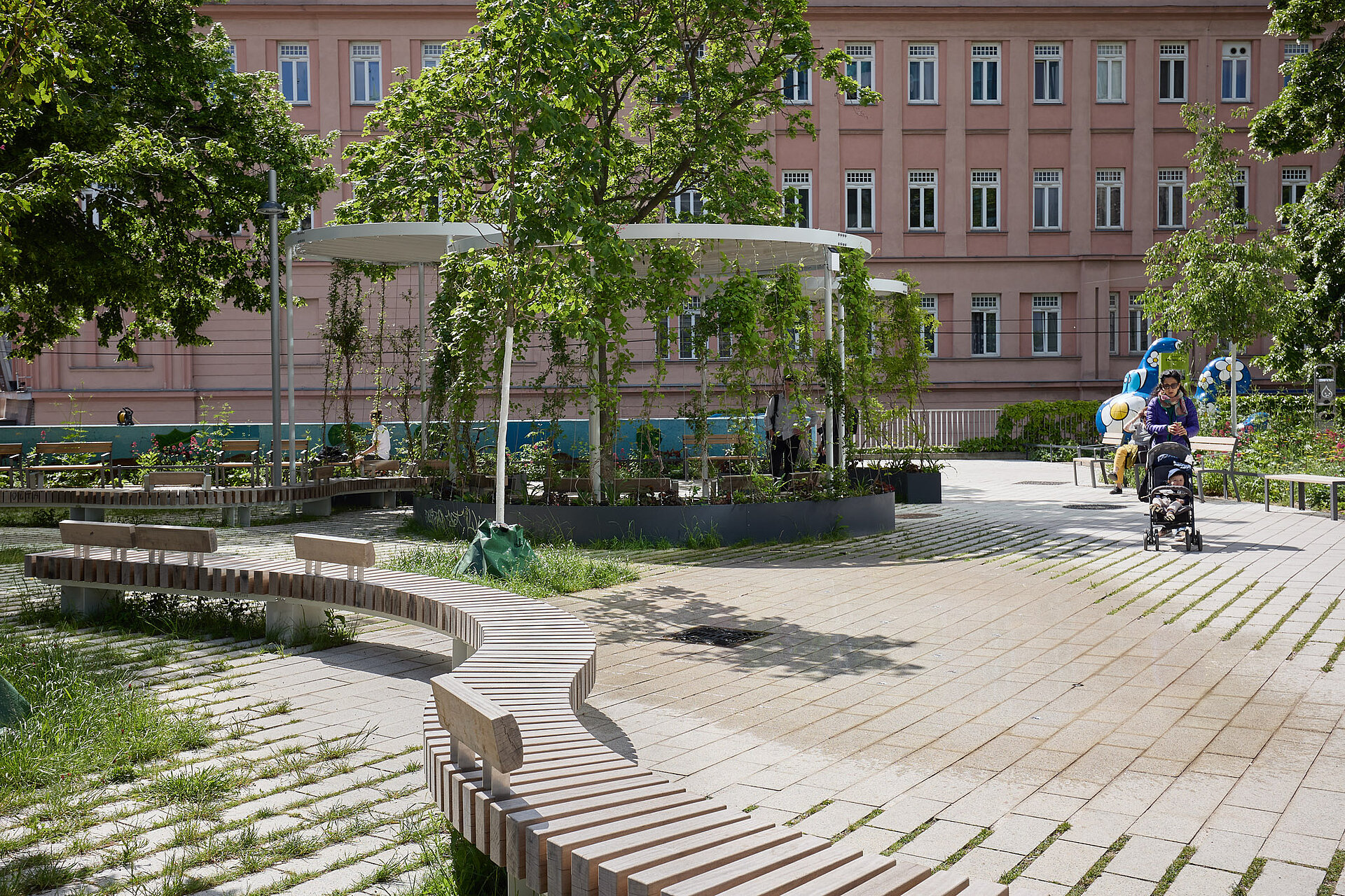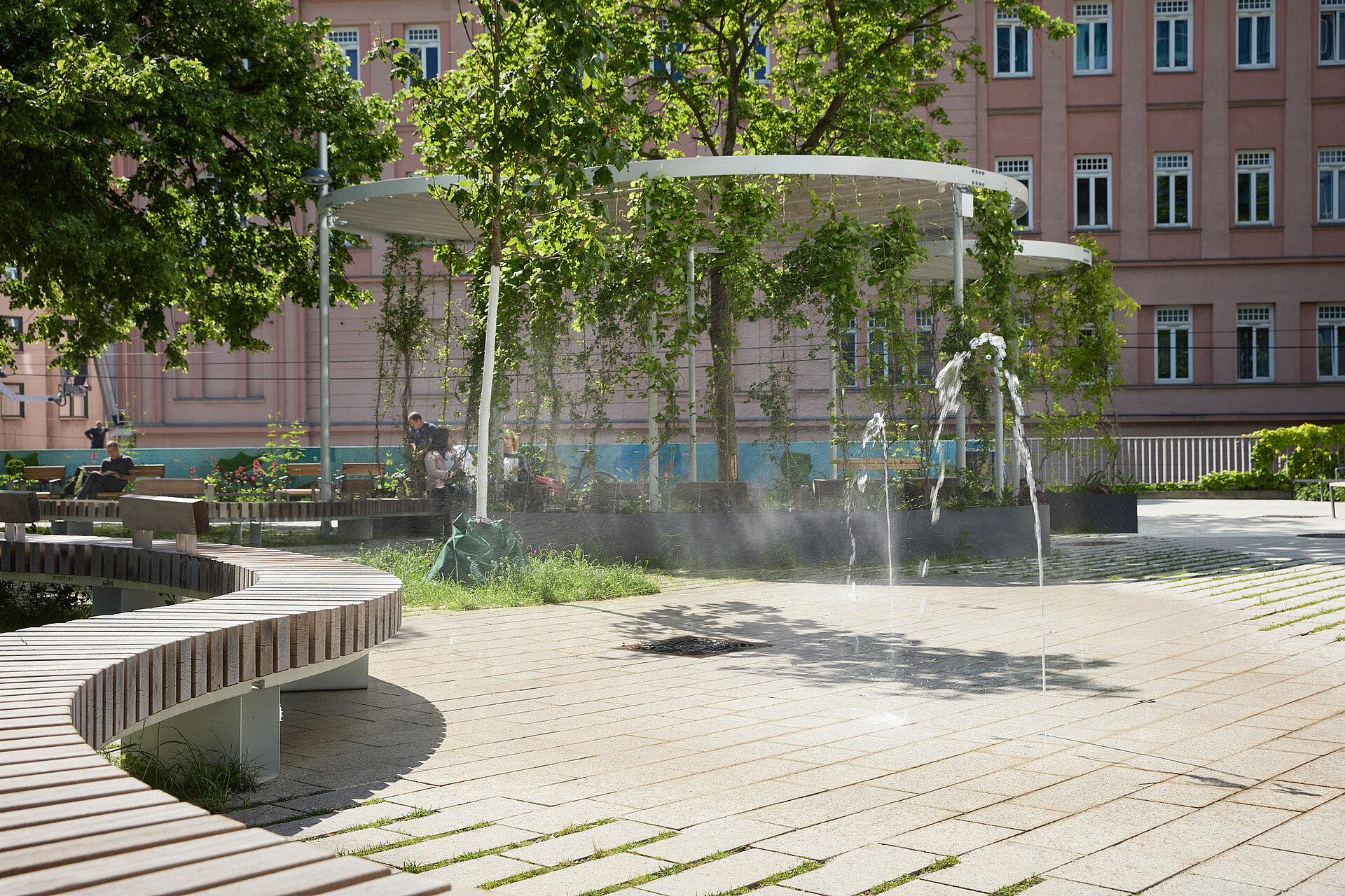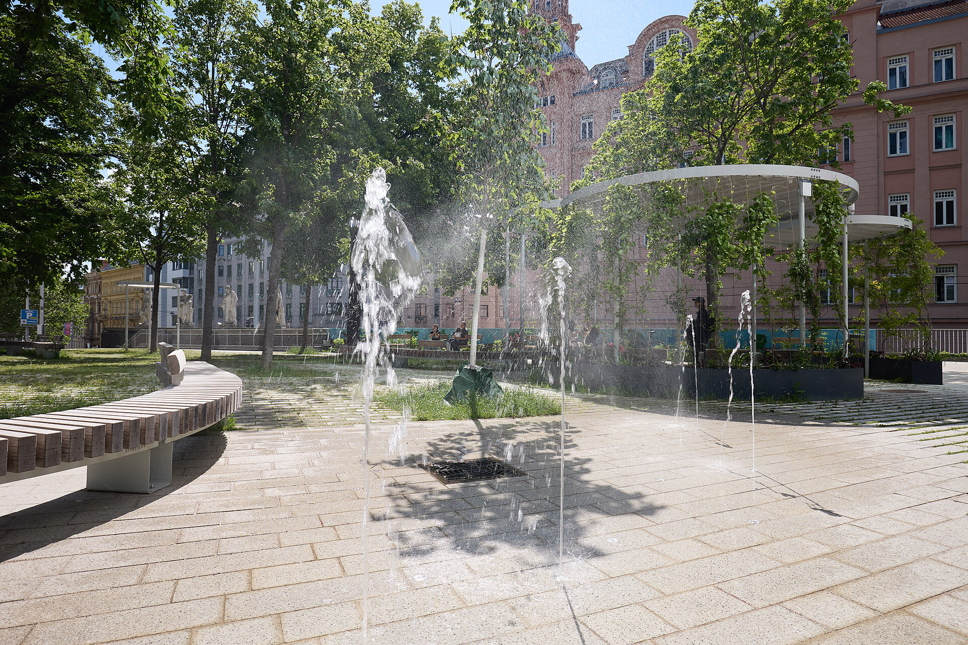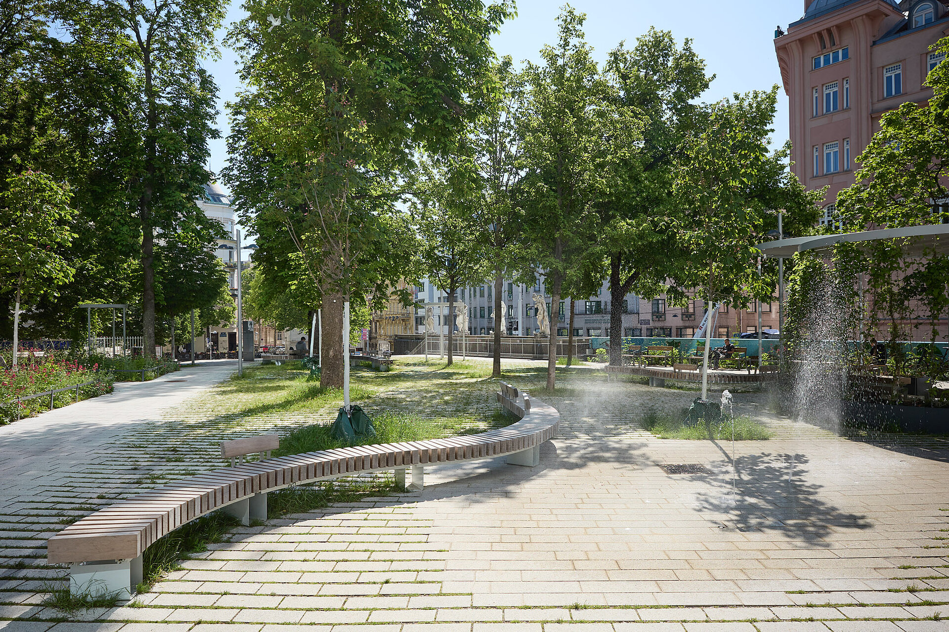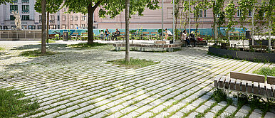 Für die Umsetzung der Schwammstadt-Idee kamen Beläge zum Einsatz, die ein hohes Maß an Versickerung und Begrünung ermöglichen. Die Bodenflächen wurden mit hellen, entsiegelten Betonsteinen realisiert, die durch breite, begrünbare Fugen das Regenwasser aufnehmen und speichern können. Diese Materialien bieten nicht nur eine dauerhafte Befestigung, sondern auch genügend Raum für Substrat, um eine erfolgreiche Bepflanzung zu gewährleisten. Das gespeicherte Wasser versickert kontrolliert ins Grundwasser und steht den Pflanzen bei Trockenheit zur Verfügung. Die hellen Steinoberflächen tragen zur Reduzierung der Hitze bei, da sie das Sonnenlicht reflektieren und somit die Aufheizung der Fläche verringern. In Verbindung mit den begrünten Fugen entsteht ein spürbarer Kühleffekt, der das Mikroklima positiv beeinflusst. Ergänzend wurden im Park „Klimabäume“ und fast drei Meter hohe Nebelduschen installiert, die bei Hitze mit einem feinen Sprühnebel für eine gefühlte Abkühlung um bis zu sechs Grad Celsius sorgen. Die Pflasterflächen des Parks zeigen die Vielseitigkeit des Schwammstadt-Prinzips: Sie ermöglichen einen nahtlosen Übergang von befahrbaren Bereichen mit mittlerem Grünfugenanteil zu Randbereichen mit hohem Grün- bzw. Versickerungsanteil. Pflasterflächen ohne Grünfugen schließen sich problemlos an und bieten Skateboardern oder Personen mit Gepäck schnellen Durchlass. Durch die perfekt aufeinander abgestimmten Steinformate wirkt die gesamte Fläche wie aus einem Guss. Diese Art der Planung ist nicht nur funktional, sondern auch optisch ansprechend, da die Grenzen zwischen klassischem Platz und Grünanlage verschwimmen.