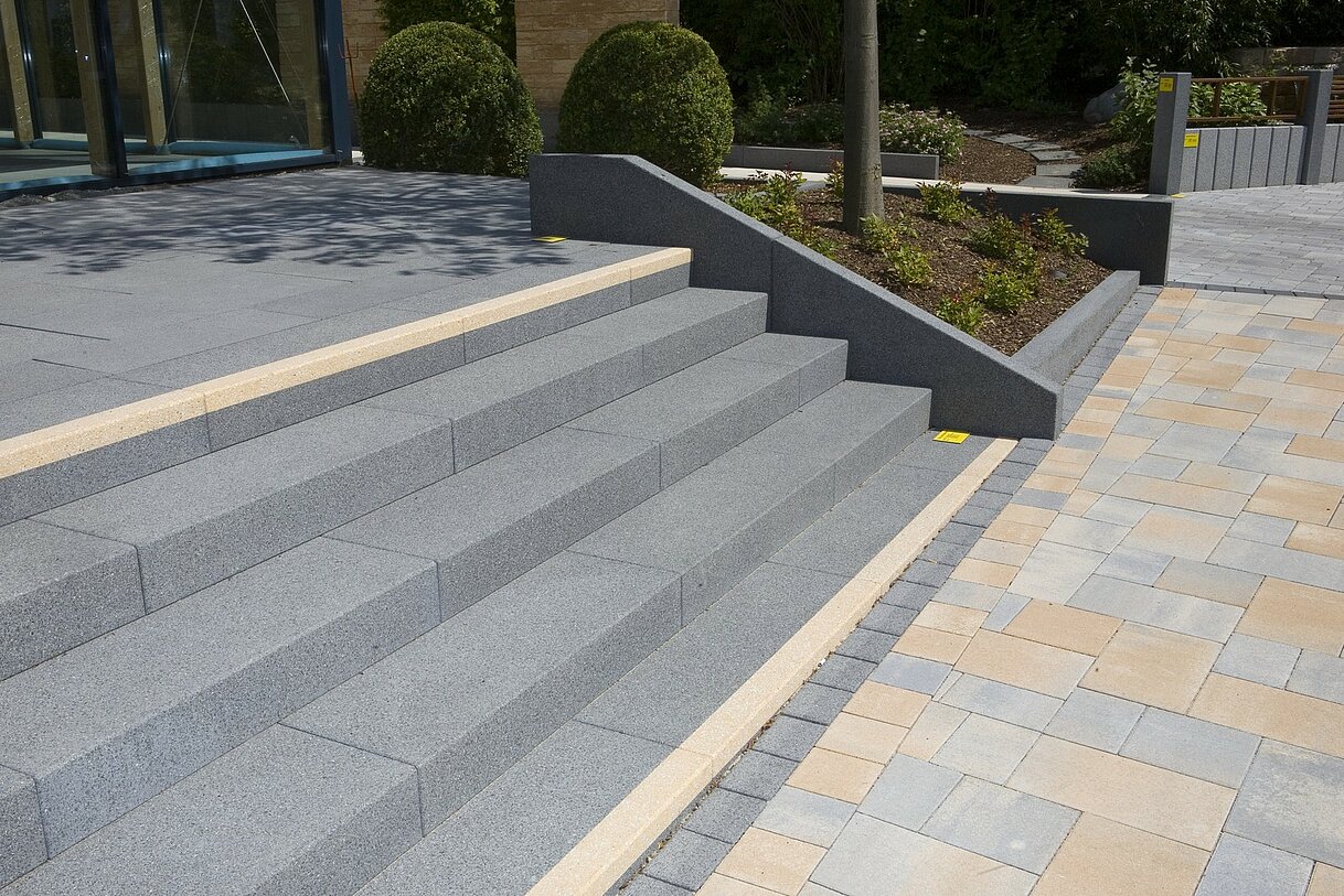 Bi-color Blockstufen rinnit Basalt mit Kontraststreifen in Gelb | Romano Mauer rustica Beige-Braun mit Radiensteinen