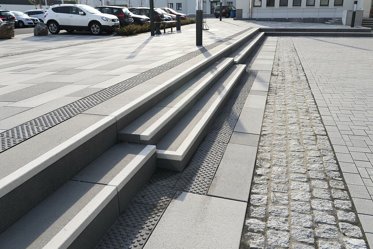 Bi-color Blockstufen als Maßanfertigung rinnit Platin weiß mit Grundschutz RSF 1 mit Oberflächenschutz Oberflächenschutz mit Kontraststreifen in Schwarz