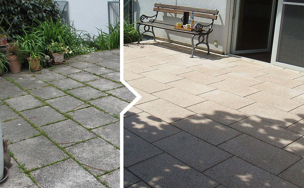 Unsere Experten der Rinn Steinpflege haben ein besonders schonendes Reinigungsverfahren entwickelt, mit dem man verschmutzte Flächen effektiv reinigen kann. Ihre Terrasse sieht danach aus wie neu.